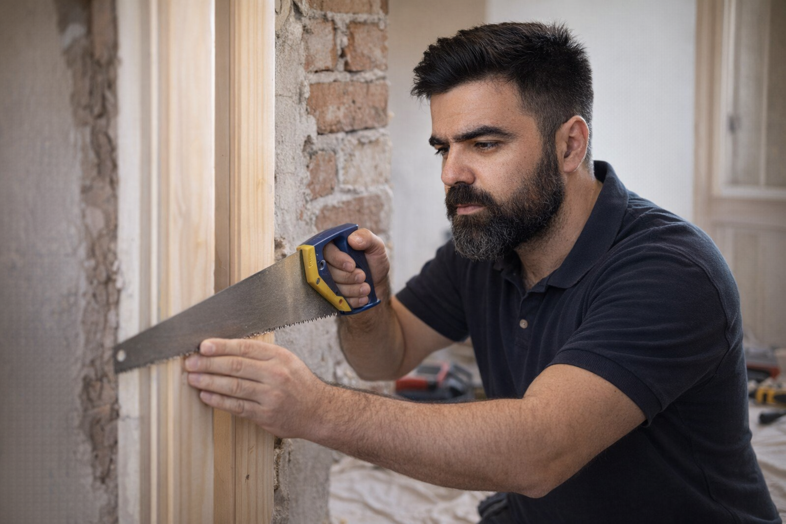 • Przycinanie skrzydła bez prowadnicy. Gdy trzeba skrócić drzwi pod nową podłogę — tną na oko i wychodzi nierówno. Potrzebna jest prowadnica i odpowiednia tarcza do pilarki.
