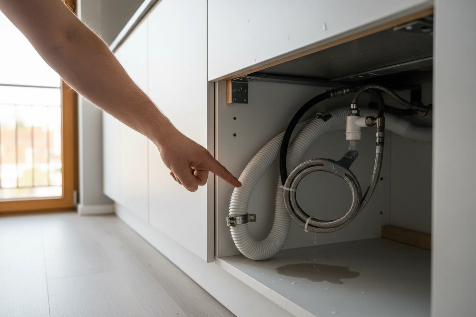 - Wąż odpływowy leży na podłodze bez pętli — woda nie schodzi prawidłowo, w zmywarce zbiera się brud i pojawia się nieprzyjemny zapach.