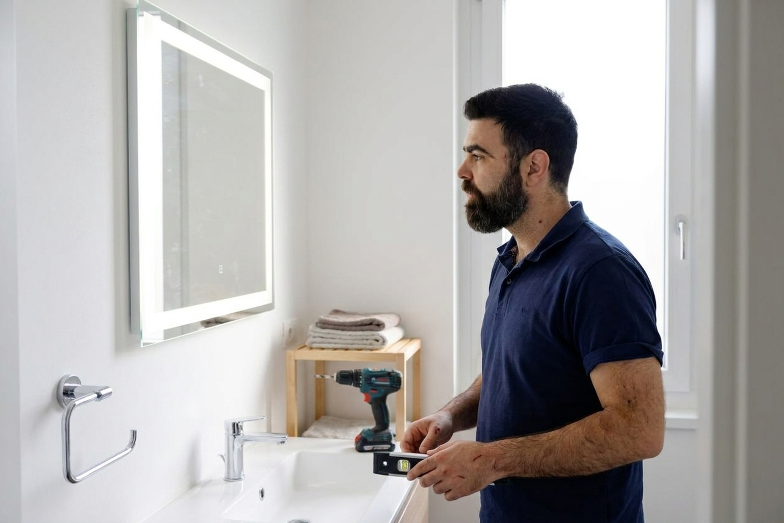 - 3. Mirror. Set at eye level and centred over the basin. On plasterboard walls — toggle bolts; on brick or concrete — expansion plugs. A mirror that sits crooked is one of the first things guests spot.