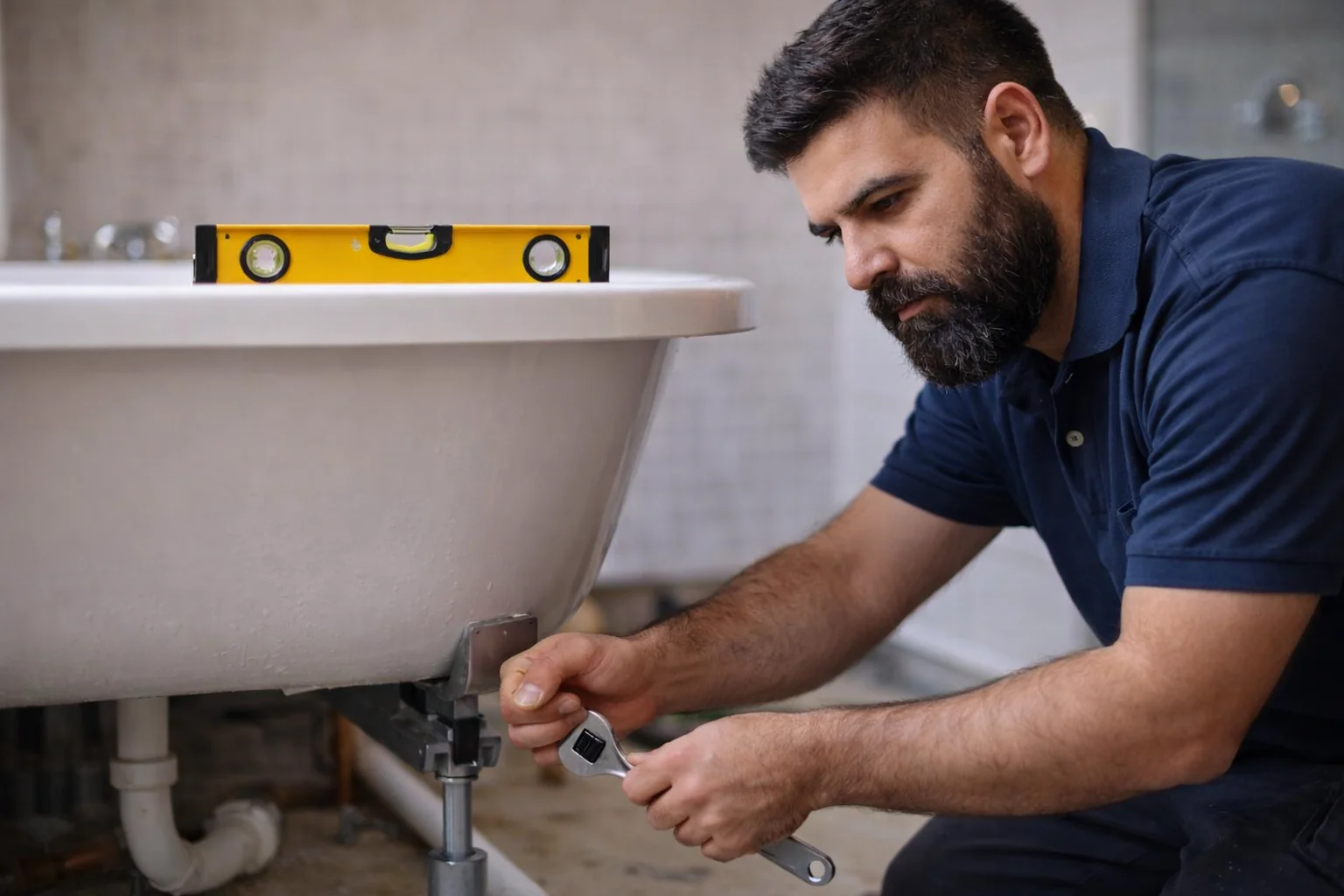 - Levelling: the bath must sit perfectly horizontal or with a very slight fall toward the drain. We check with a spirit level along the rim in both directions. A tilt is the main reason water pools on the floor.
