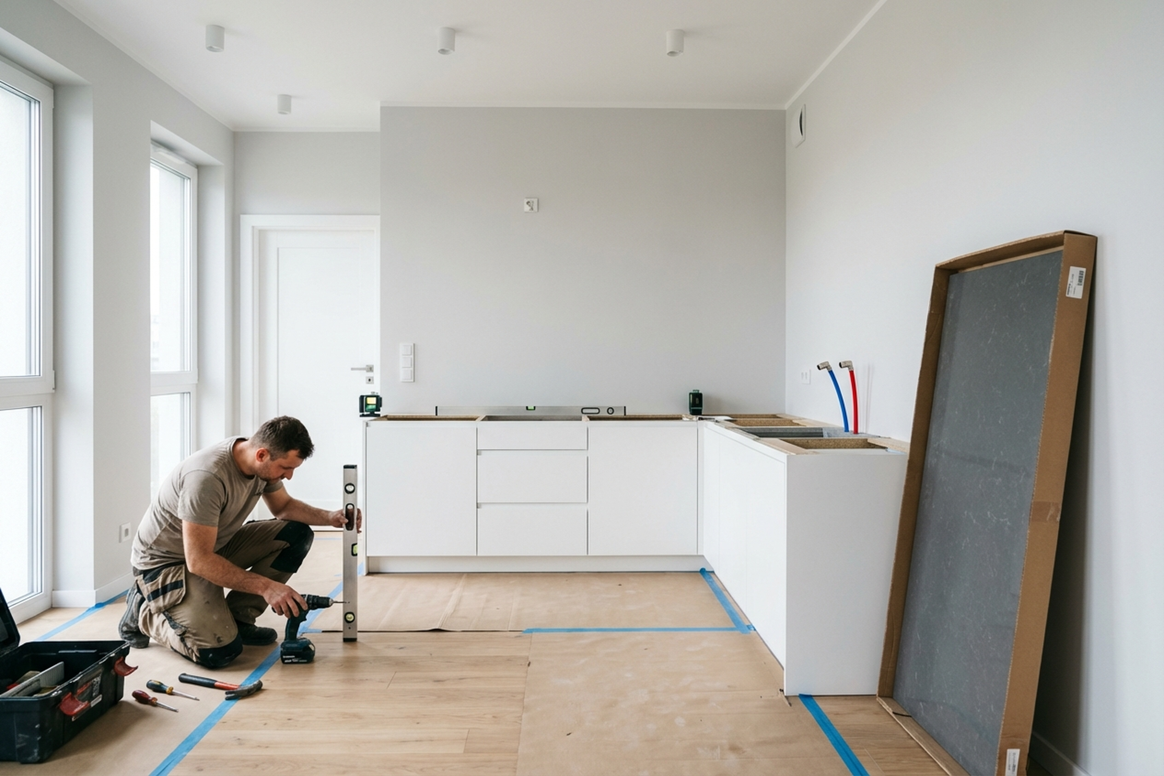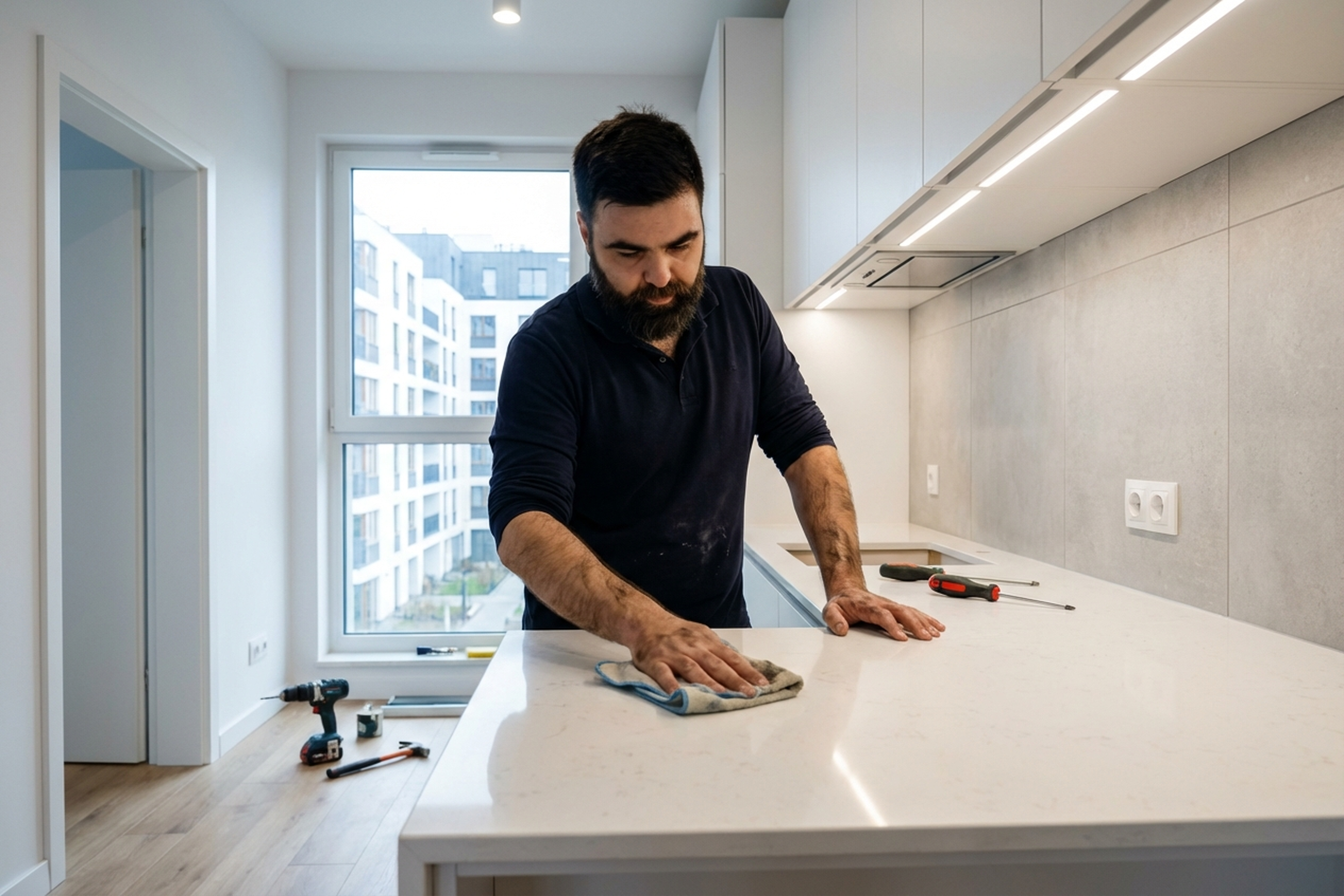 22.02.2026A composite countertop is neither chipboard nor natural stone. It is an engineered material: quartz agglomerate (Silestone, Caesarstone) or acrylic stone (Corian, Staron). These slabs are seriously heavy — quartz weighs around 50 kg per square metre, acrylic is lighter but still substantial. Attempting installation without experience almost guarantees damaging an expensive material. We work across all of Warsaw, from Mokotow to Ursynow, arriving with tools and a helper for carrying.