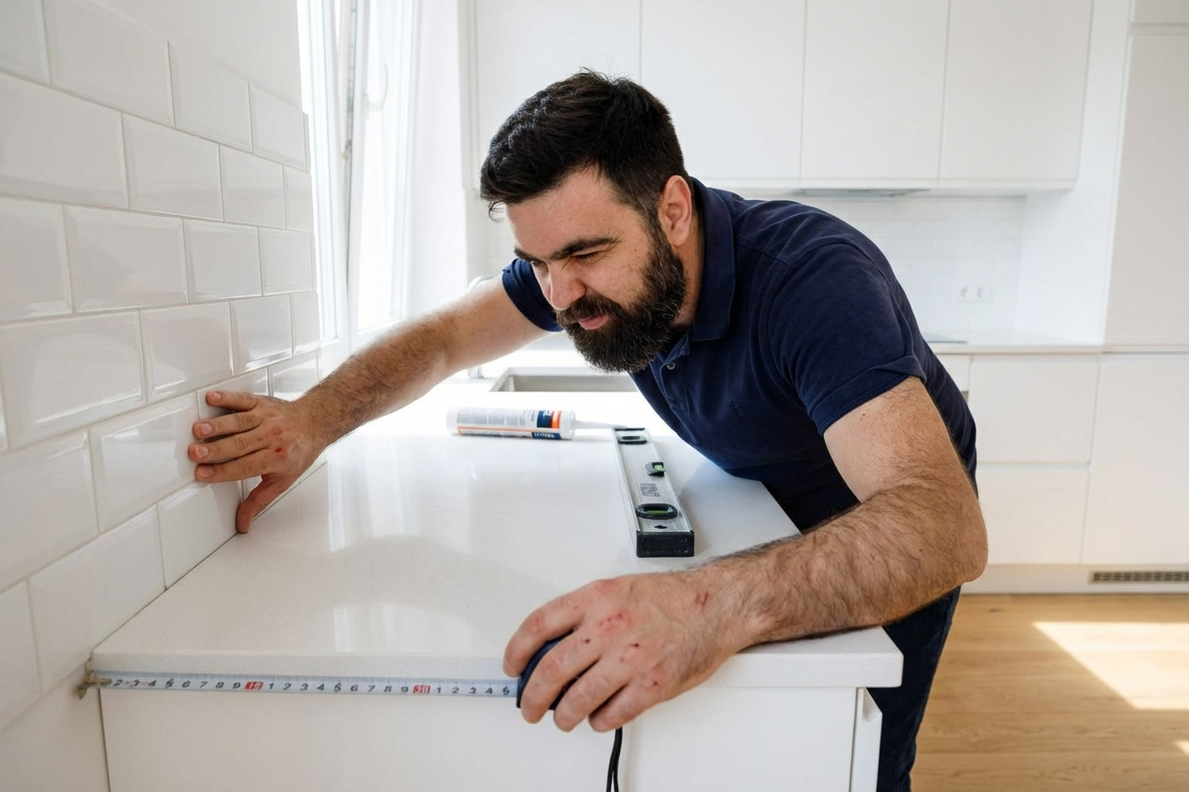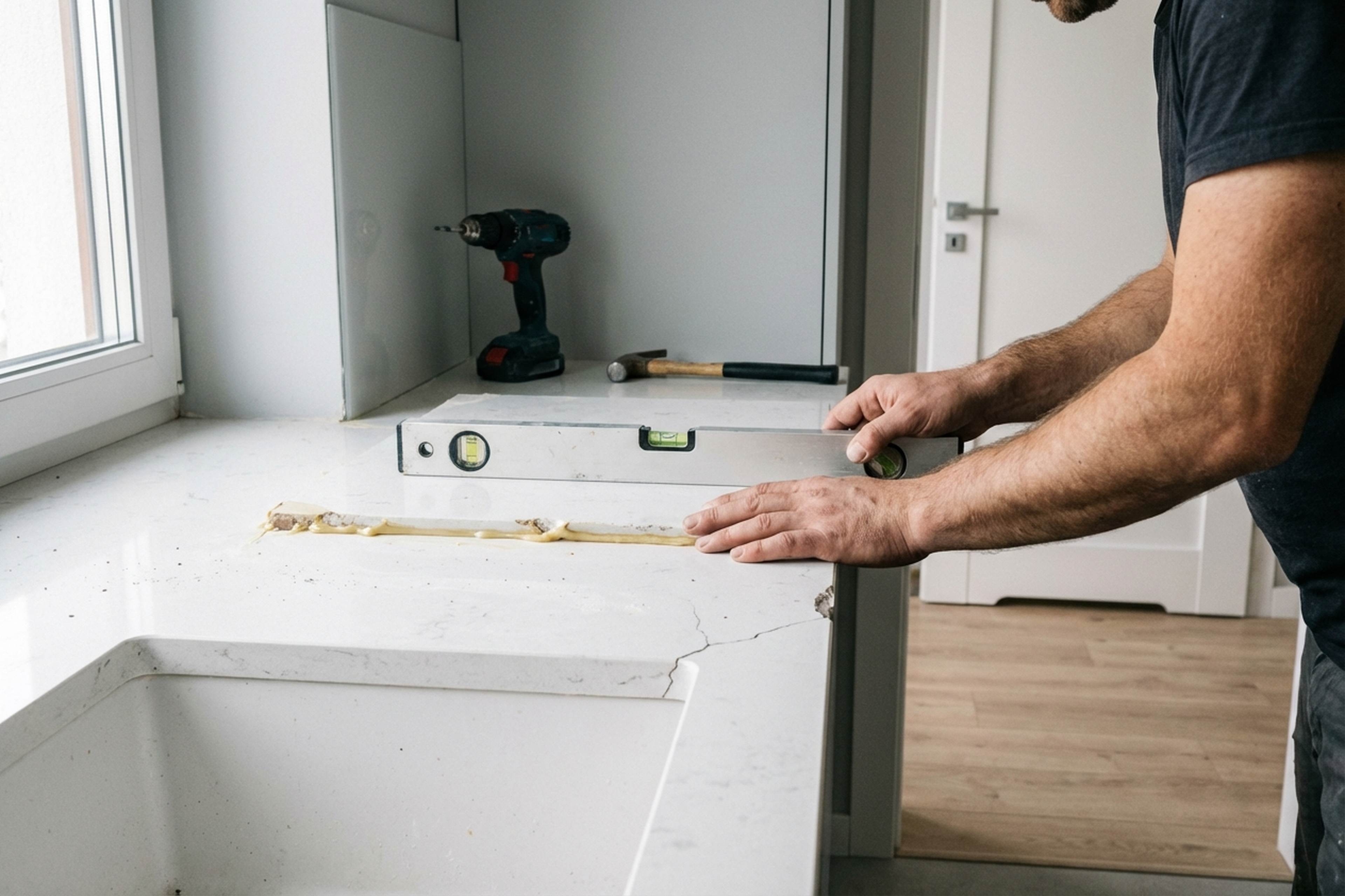 A client in the Wilanow district ordered a kitchen with a 3.2-metre Silestone quartz countertop. The slab arrived in two pieces, with the joint falling in the sink area. During measurement we found that one base cabinet was 5 mm out of level — a standard situation after self-assembled frames. We levelled the cabinet with adjustable feet and checked across the full length. We carried the slabs in together, placed them on the frame, and bonded the joint with two-component adhesive in “Calacatta Gold” colour. After curing, the seam was barely detectable by touch. We fitted the under-sink cutout with edge treatment and installed the wall upstand. The whole job took about 3 hours. The client noted that without a helper it would have been physically impossible to get the countertop up to the second floor. Takeaway: always check cabinet level before laying — correcting a tilt after the countertop is mounted is no longer possible.