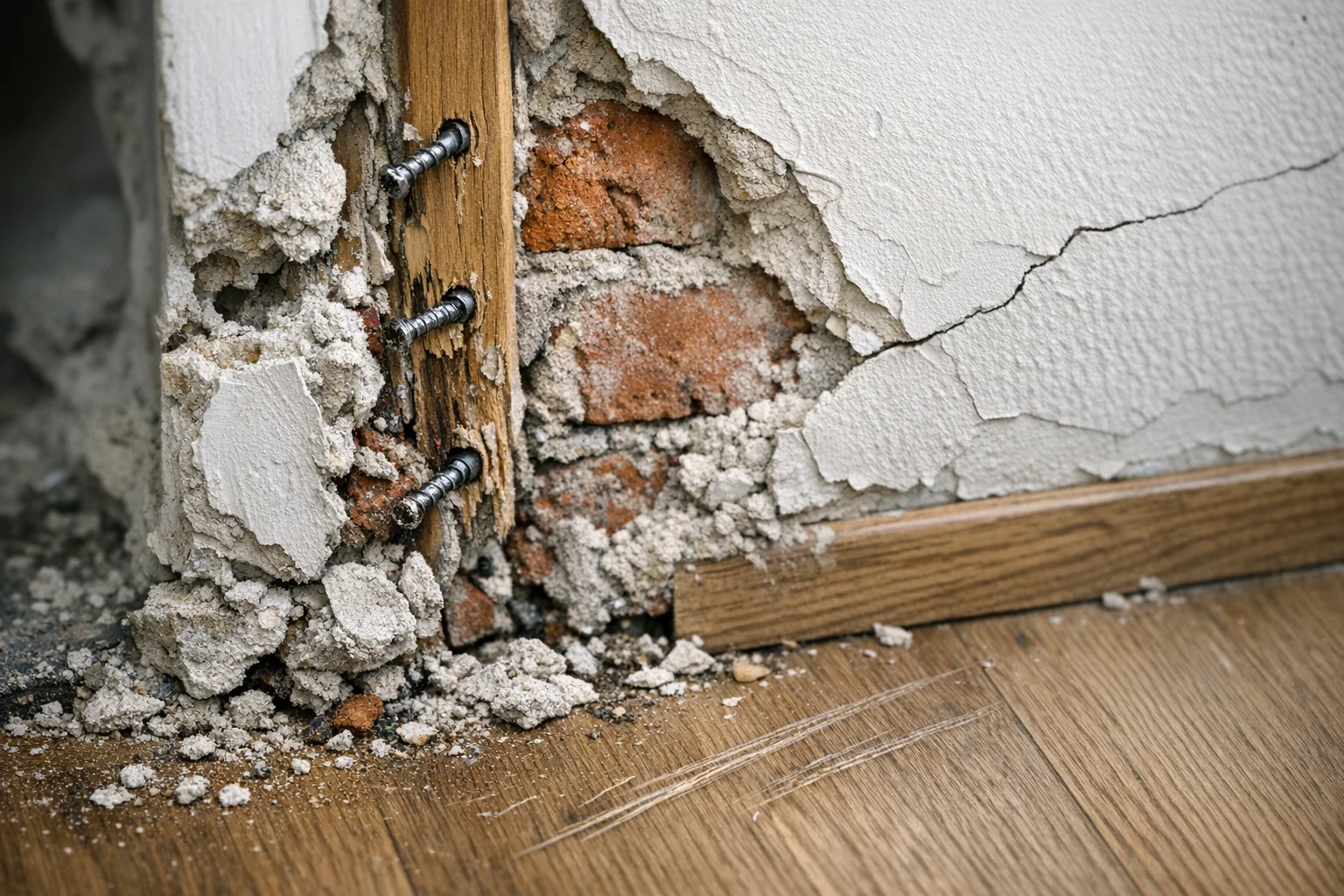 - Inspecting the assembly. The technician identifies the frame type (timber, MDF, metal), the fixing method (foam, nails, plugs, anchors) and the wall condition. This determines the tools and the order of operations.