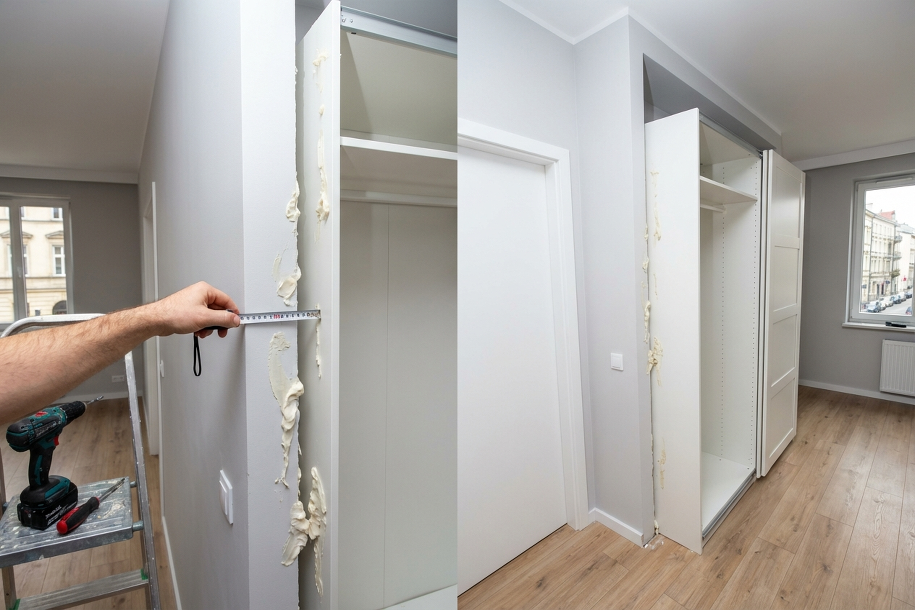22.02.2026Bought a wardrobe that is 2 cm too wide for the alcove? Or it fits but there are finger-wide gaps on both sides? In older Warsaw buildings in Praga and Mokotow, walls are rarely straight and alcoves are seldom perfectly rectangular. Off-the-shelf furniture is not made for your exact dimensions. We fit furniture to alcoves: trim, extend, add filler panels, close gaps — so the wardrobe looks built-in, even if it came from IKEA.