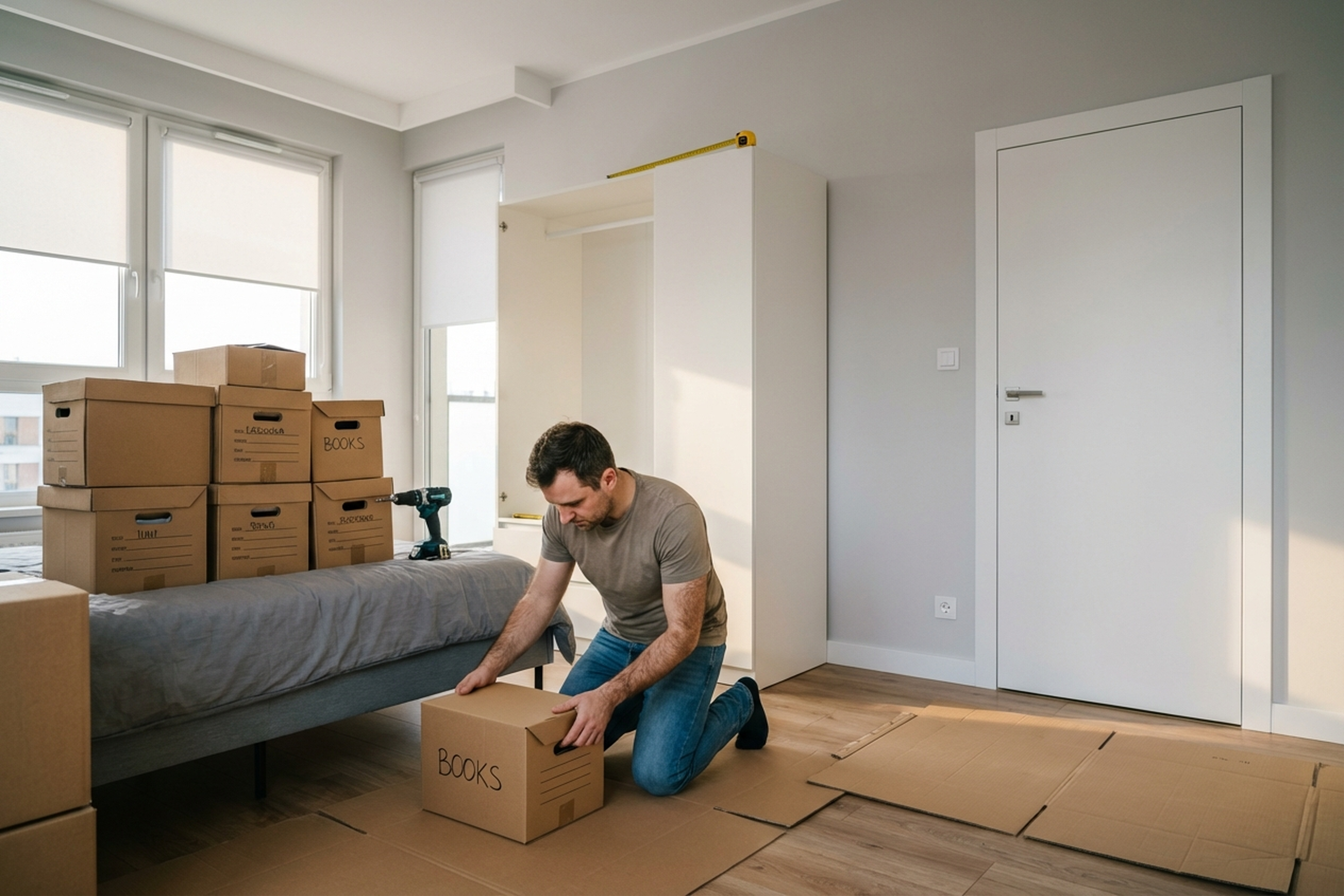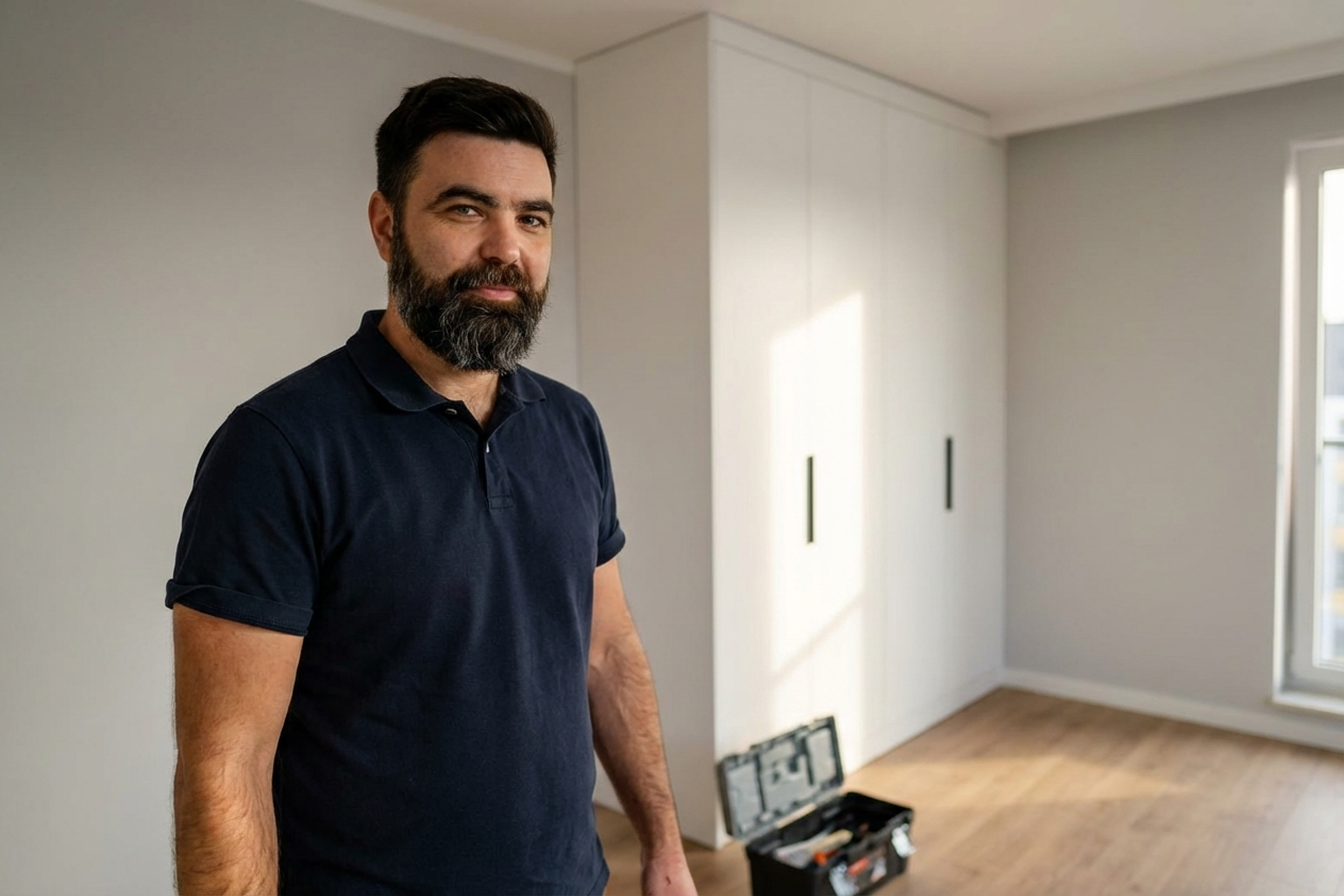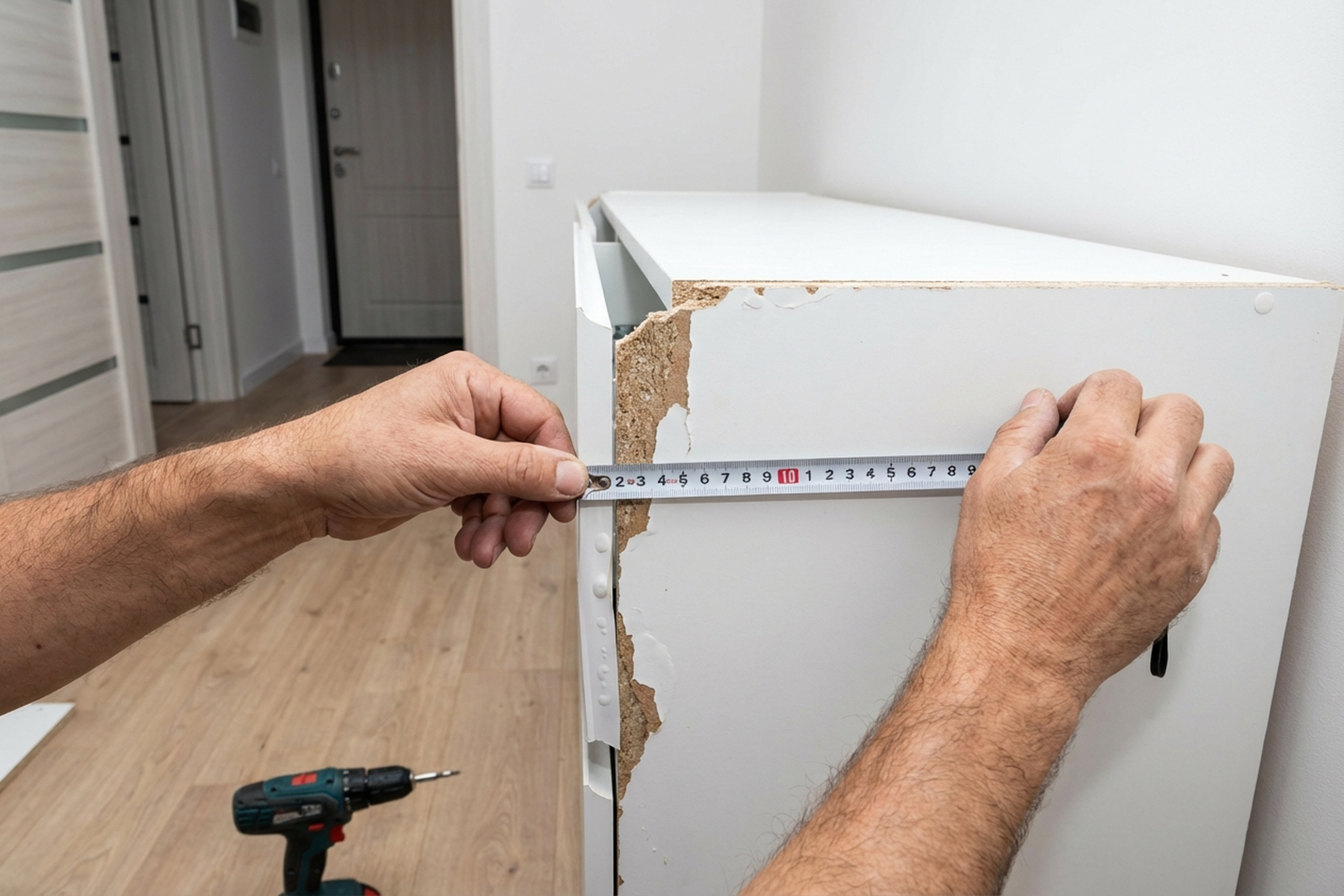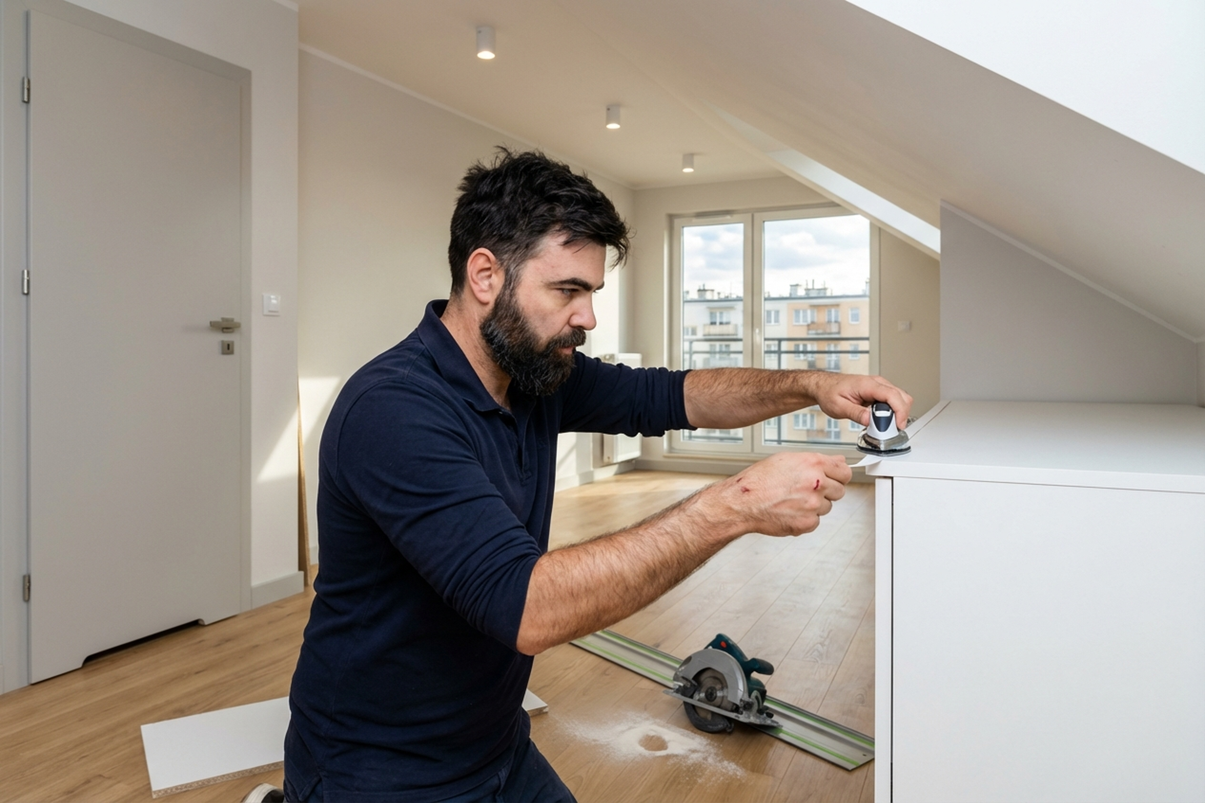 A client in Mokotow bought a 240 cm wardrobe, but the ceiling height after a stretch ceiling installation turned out to be 232 cm. Returning the wardrobe was expensive and slow. The technician arrived, disassembled the wardrobe, removed the top and both side panels. He trimmed the sides by 8 cm using a circular saw with a guide rail, finished the edges with 0.4 mm PVC banding in Sonoma oak. He re-drilled the holes for shelf supports and the clothes rail. Reassembled, adjusted the sliding doors. The job took three hours. The wardrobe fit perfectly — 5 mm gap to the ceiling, doors sliding smoothly.