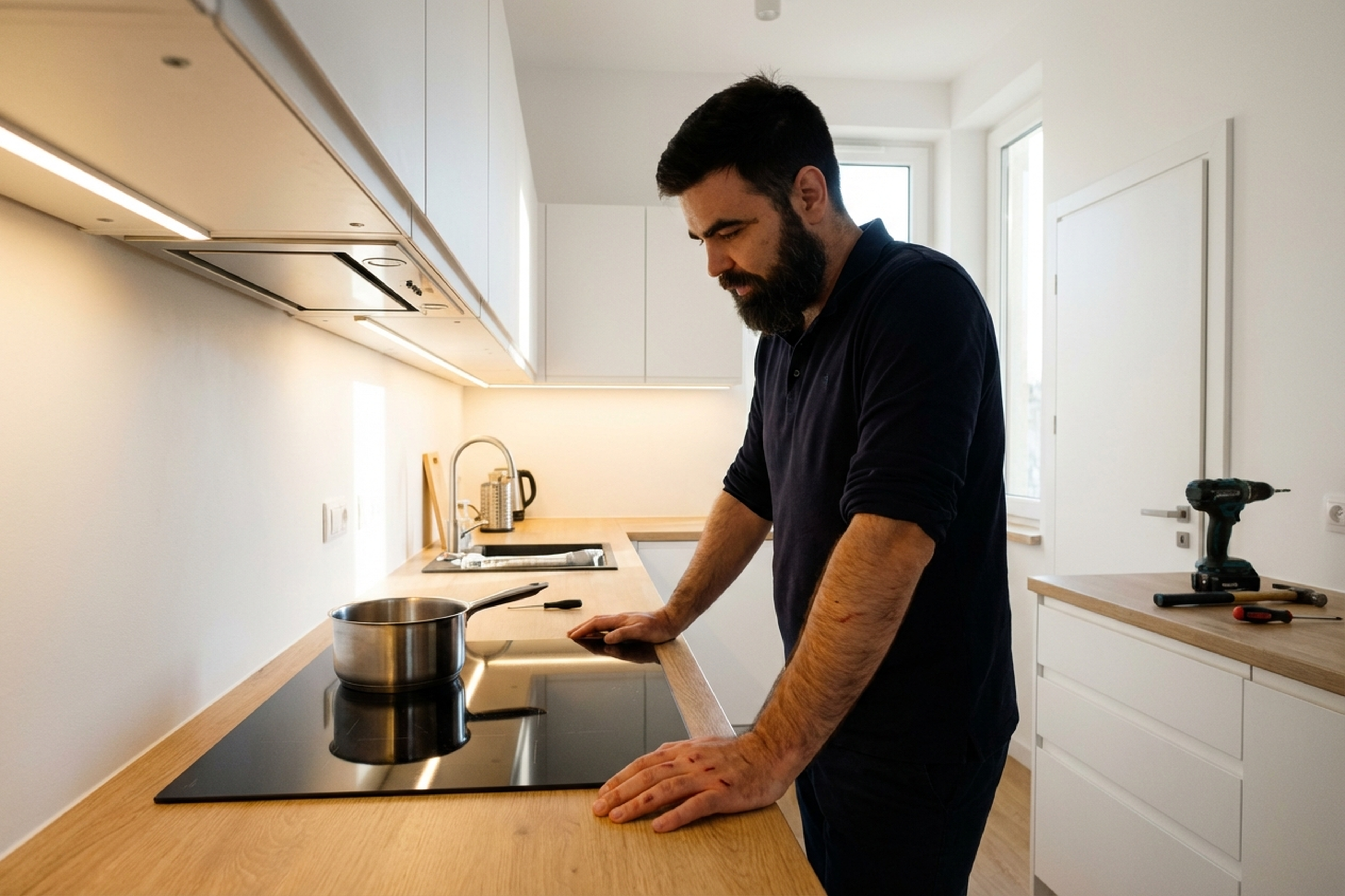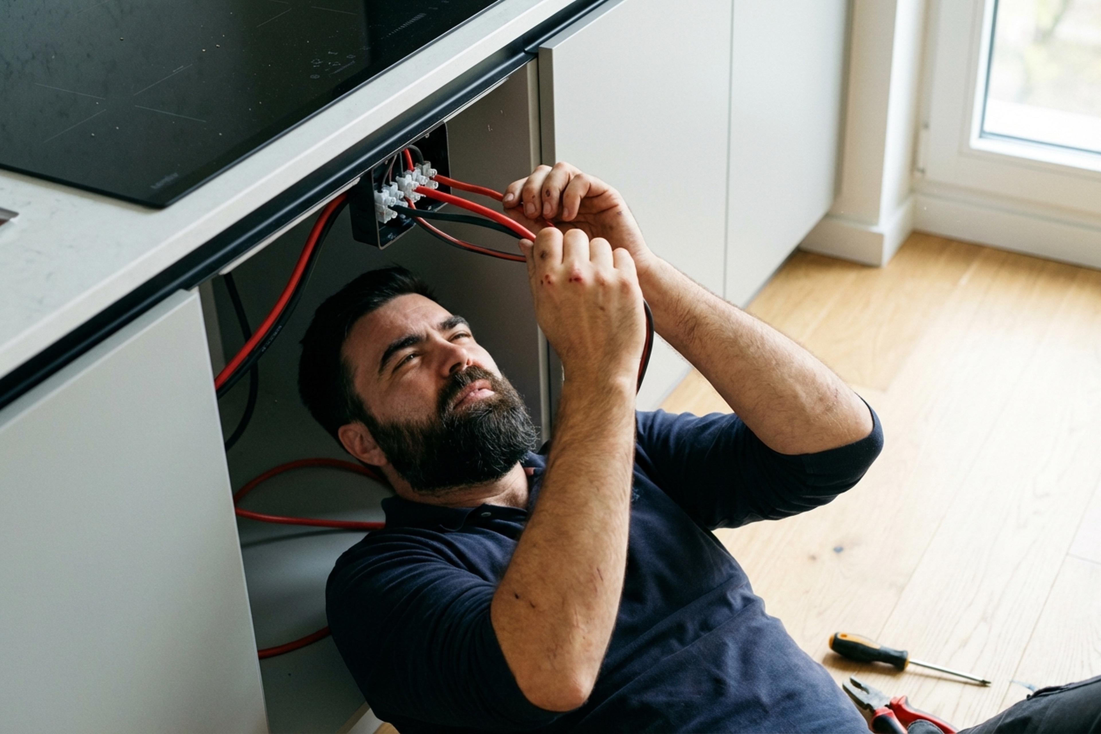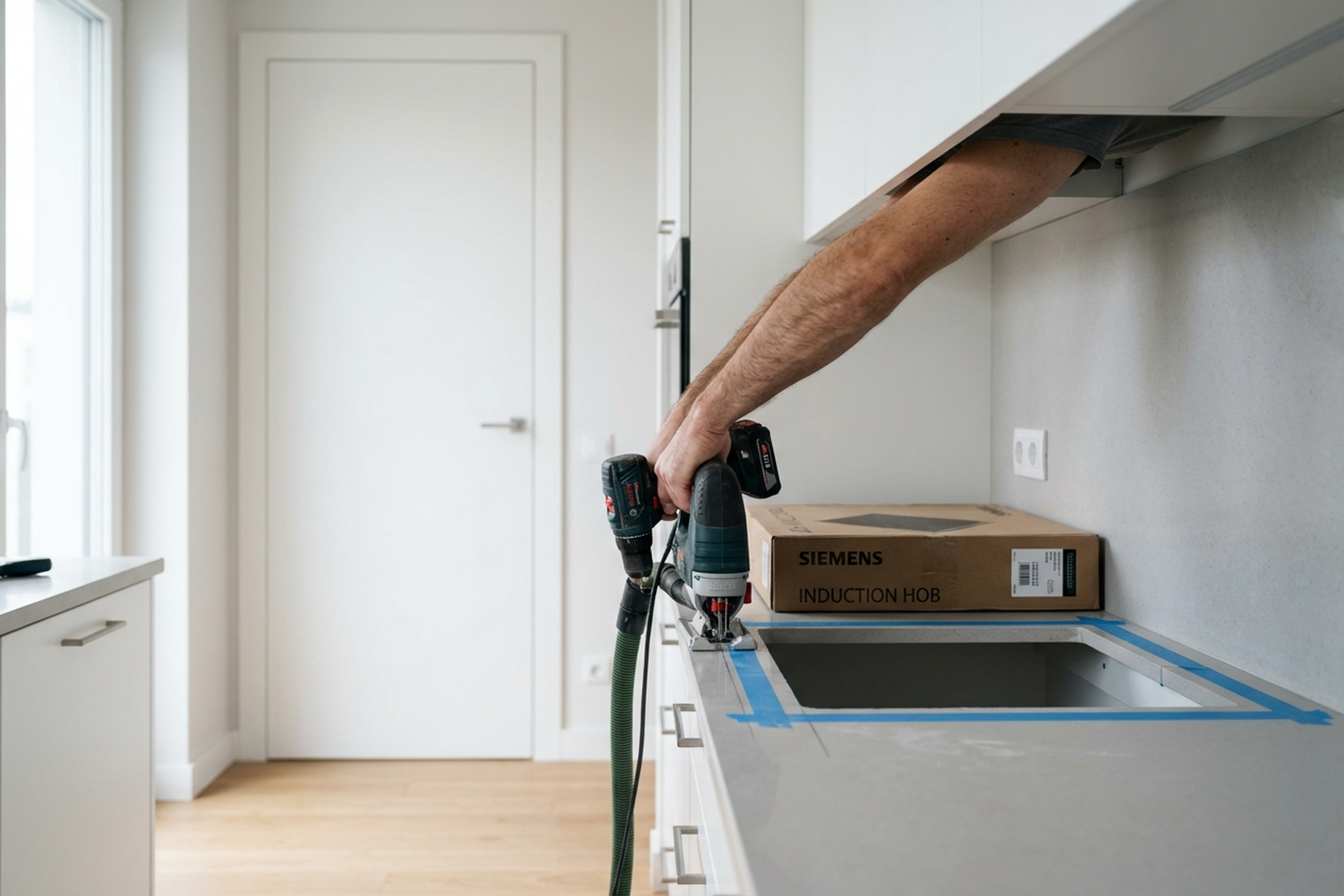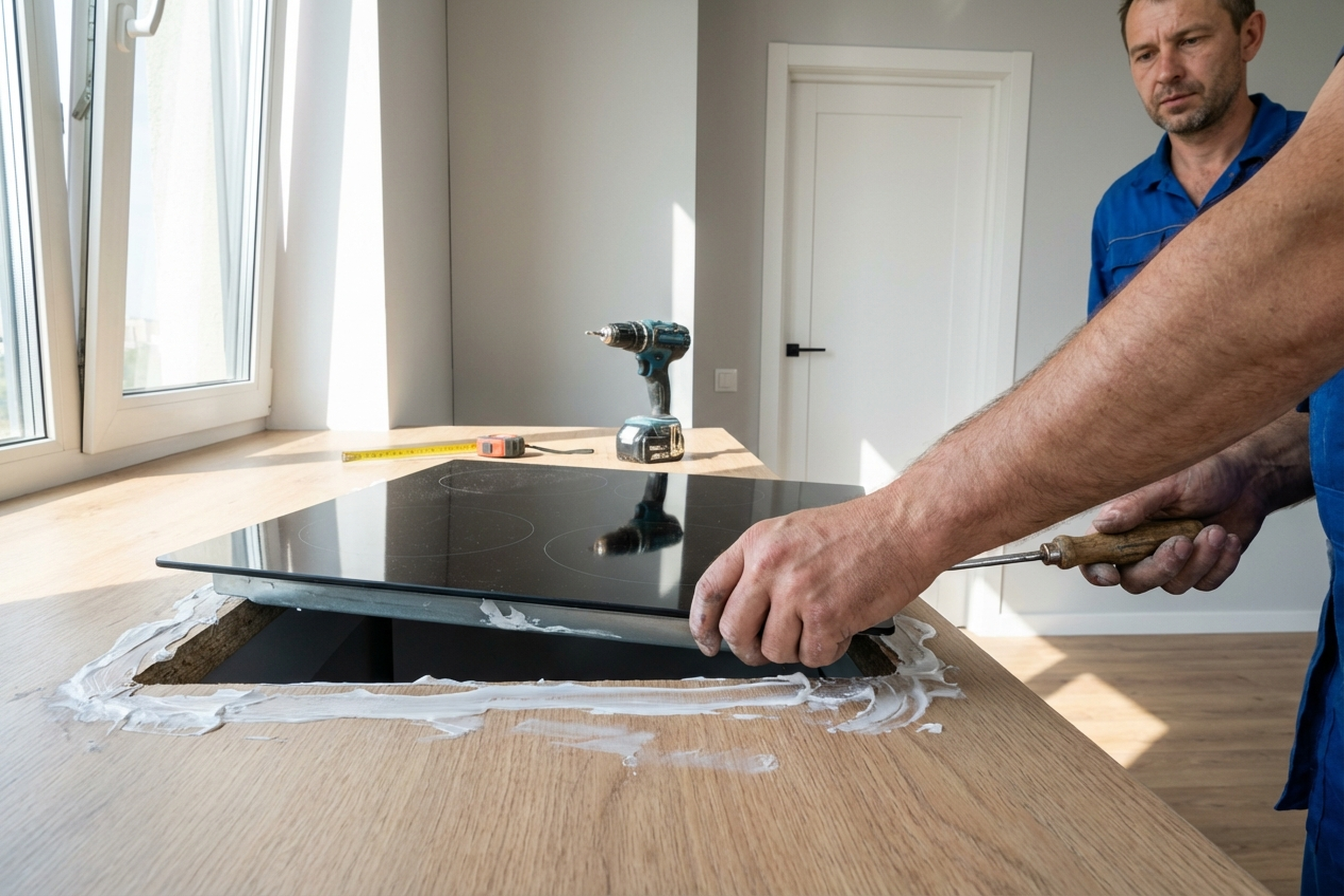 Cutting the worktop and seating the panel is technically doable with a jigsaw and some experience. But connecting to the power cable should be left to a professional — mistakes here are costly.