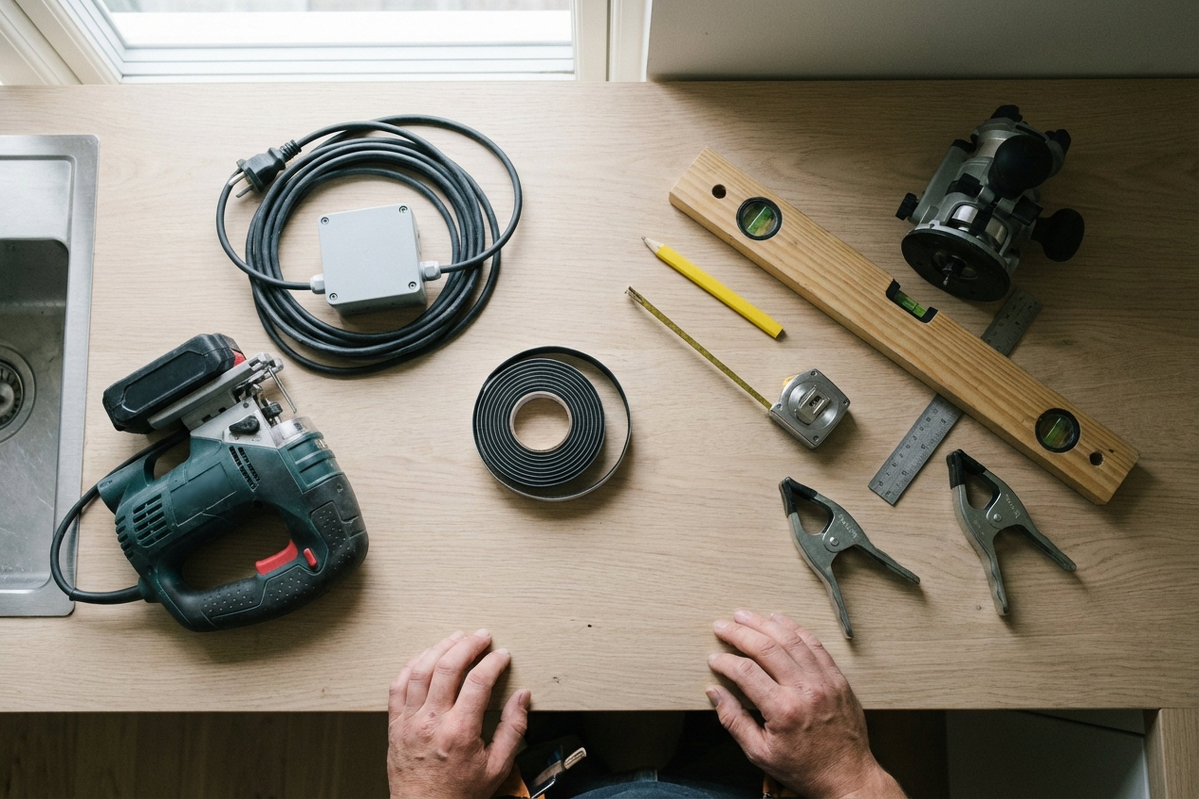 4. Cuts the opening with a jigsaw (laminate, wood) or router. Edges are finished and sealed with silicone if needed.