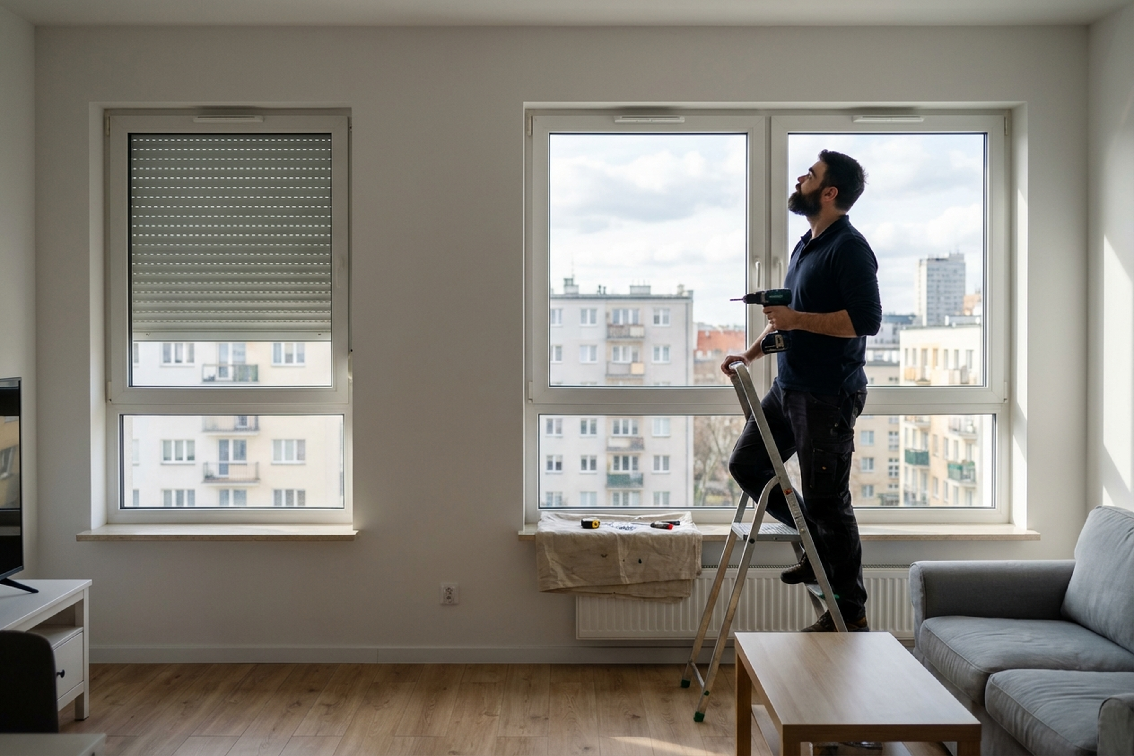 A client in Mokotow ordered day-night cassette blinds for four windows in the bedroom and living room. Standard uPVC tilt-and-turn windows. She bought the blinds herself from IKEA, but the size turned out to be slightly too large — 2 cm wider than the frame. Rather than returning them, we decided to trim the roller tube and fabric on site.