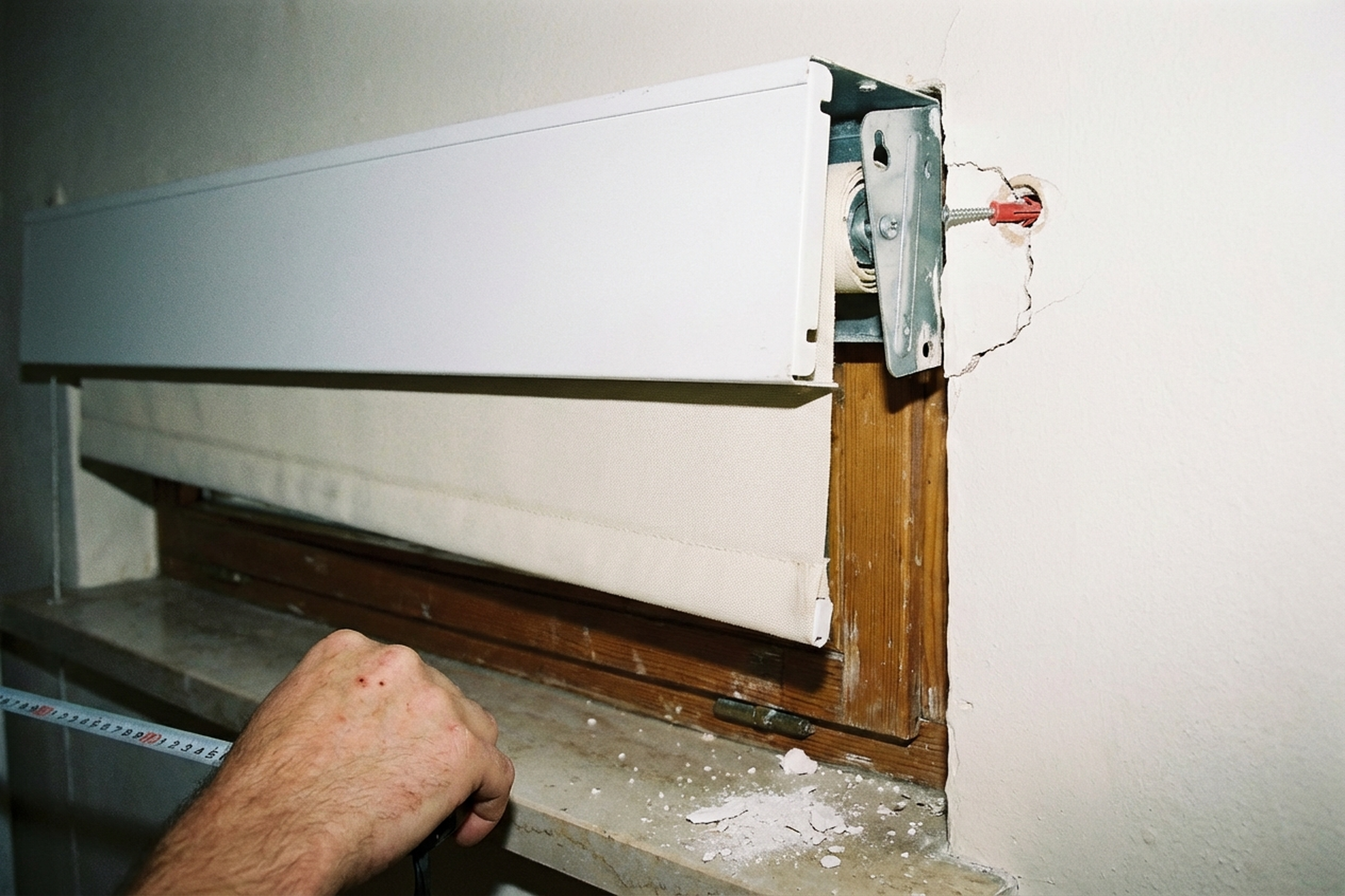 - Measuring and marking. The technician measures the window width and height, confirms the blind fits. He marks the bracket positions using a spirit level so the fabric hangs straight.