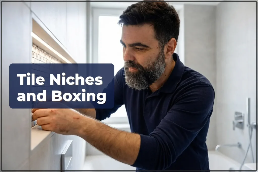 - Tiling. We start from the main wall then move to the niche/boxing so joints align. External corners get an aluminium trim or a 45-degree mitre.