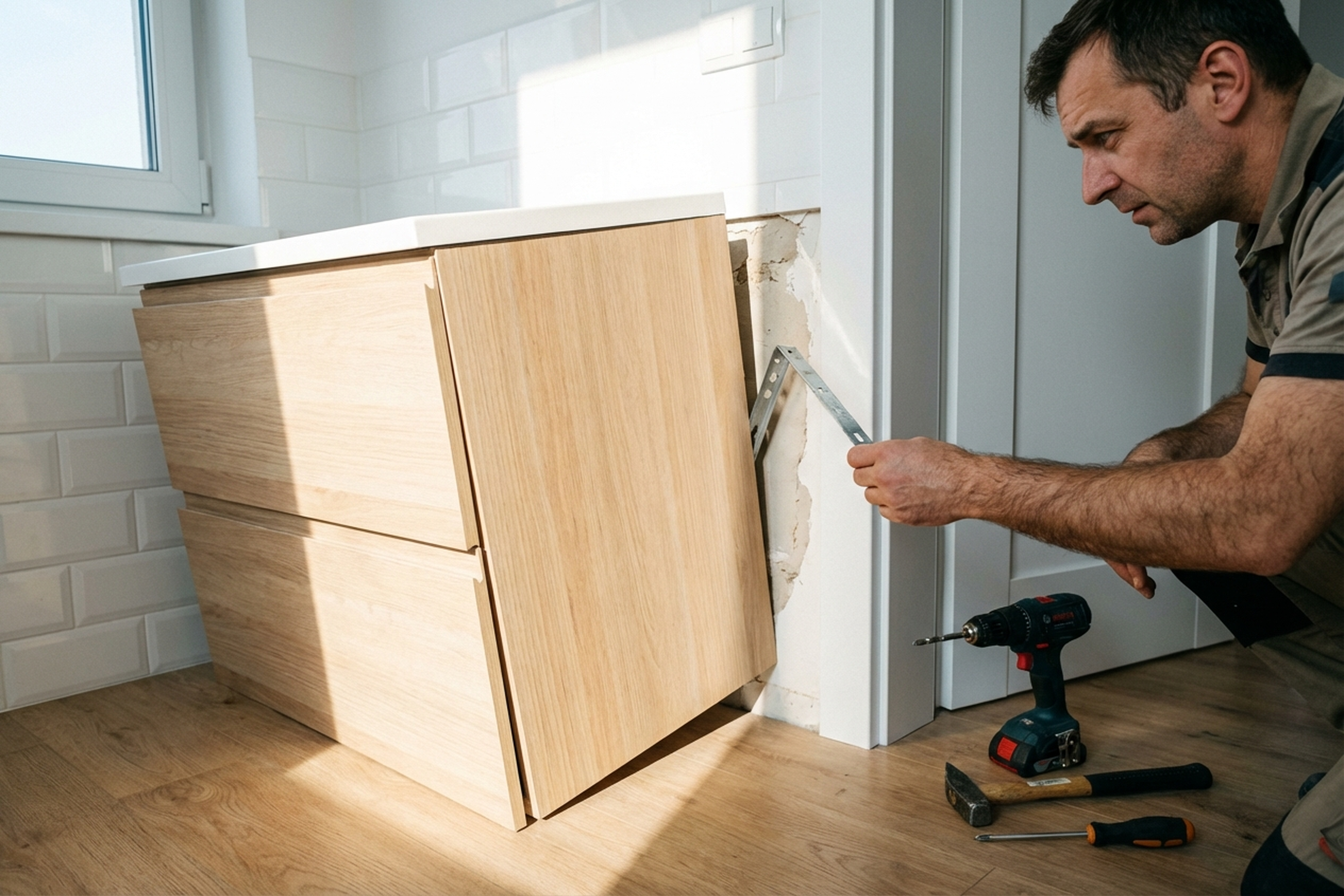 - Cabinet assembly following the manufacturer’s instructions — hinges, shelves, drawers. If the unit arrived flat-packed, we build it from scratch.