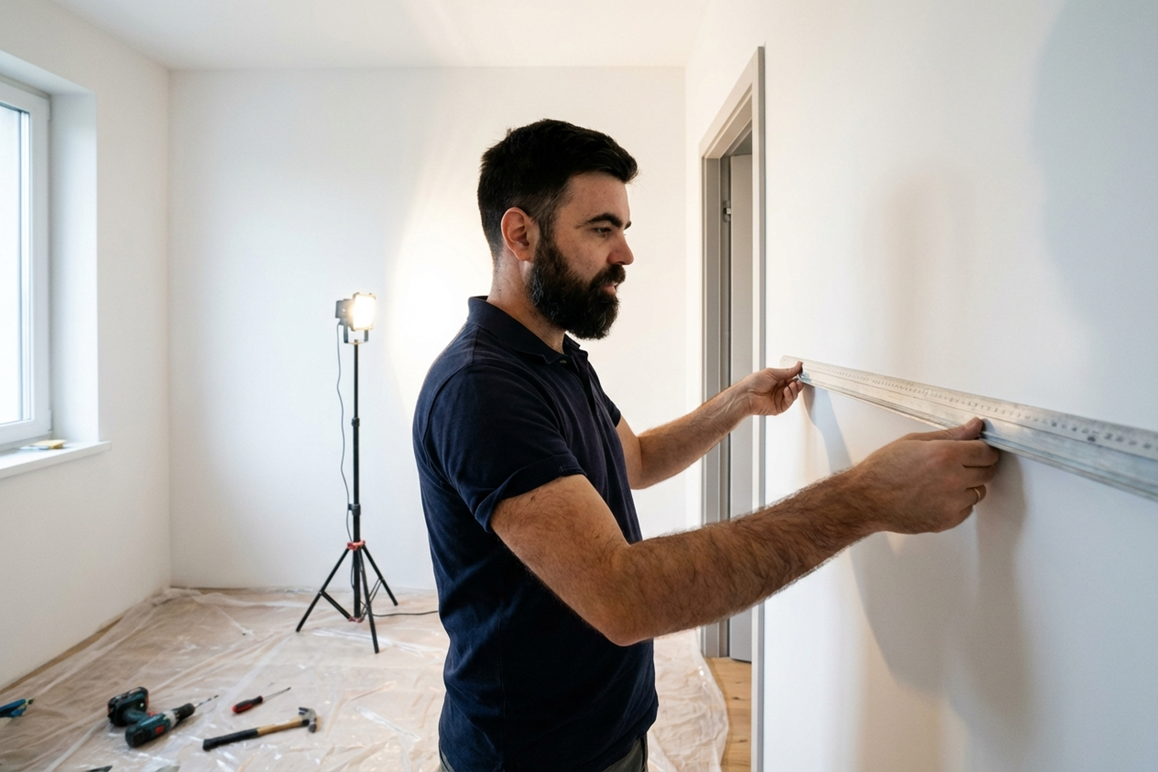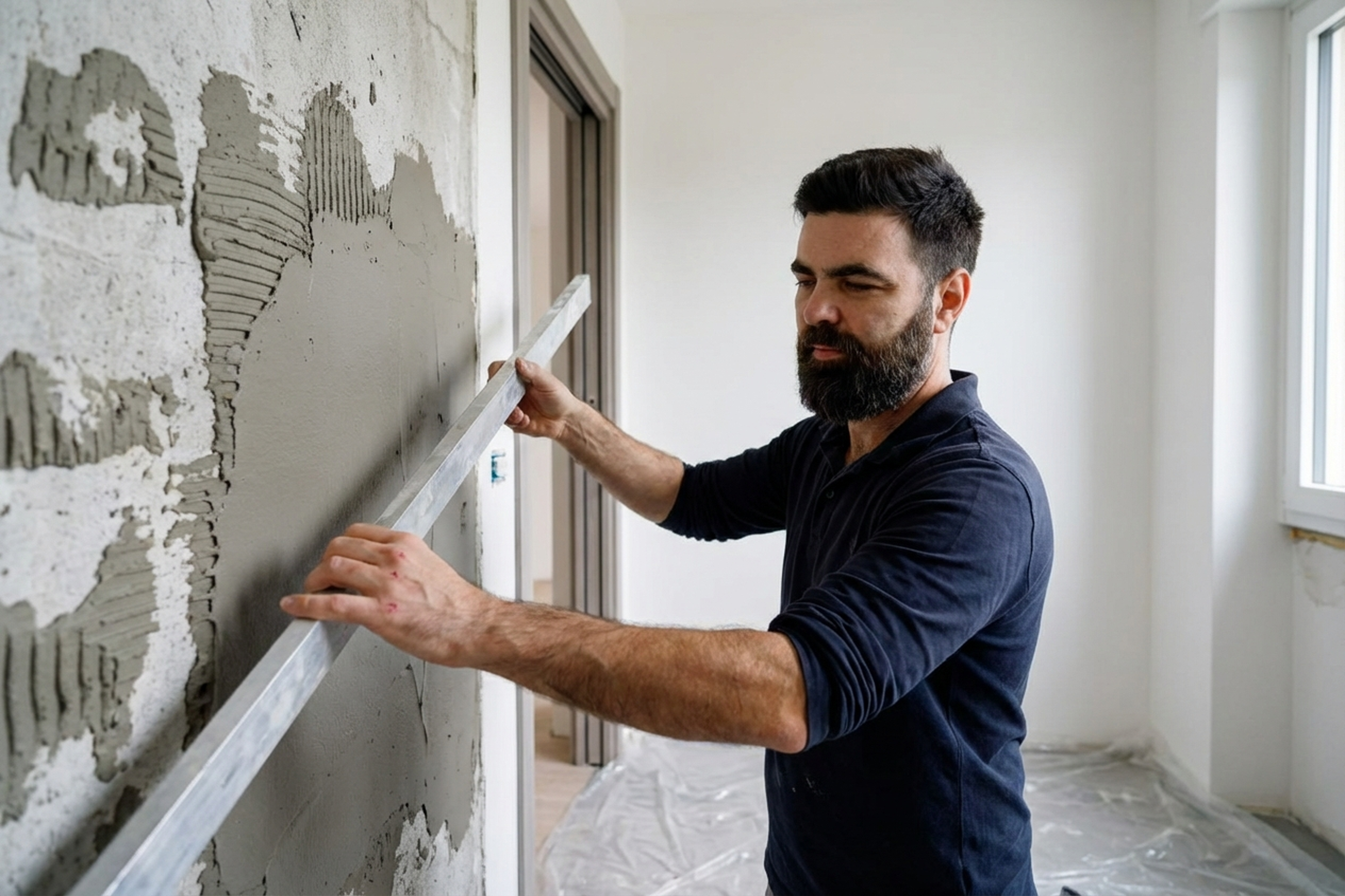 - Levelling: filler is applied (gypsum for dry rooms, cement or polymer for bathrooms). A long straight edge or wide trowel — depending on the area.