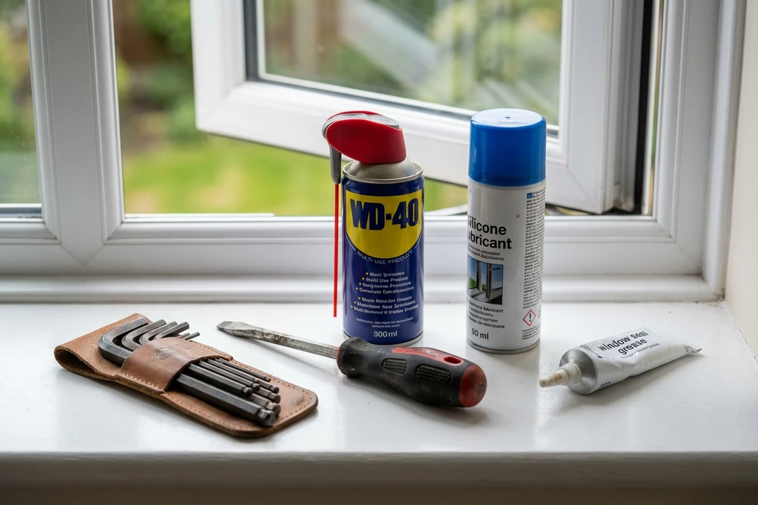 - Checking and lubricating the hardware. We apply silicone lubricant to every moving part: hinges, cams, scissors, handle gearbox. This reduces wear and makes opening easier.