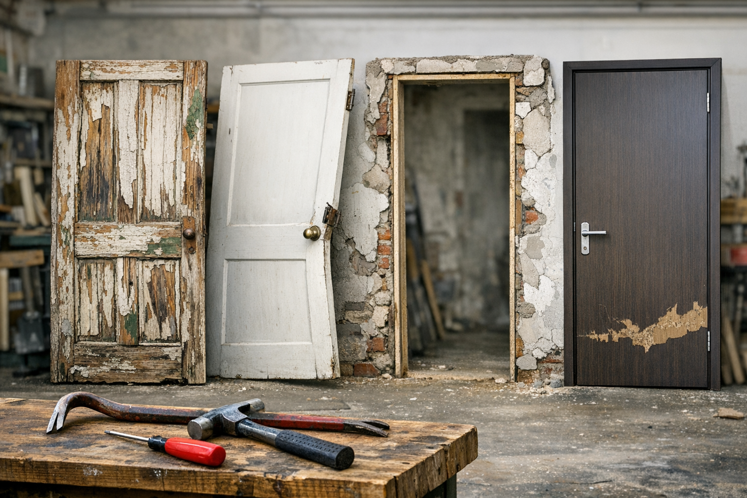 The cost of removal depends on the type of construction and the condition of the wall around the opening. A simple case is a hinged door on butterfly hinges with a foam-set frame — it comes out in 20-30 minutes. A difficult one is a 1970s door nailed into a concrete wall, its frame buried under layers of paint and plaster. That has to be cut out piece by piece. The number of doors also matters: removing several in the same flat brings the unit price down.