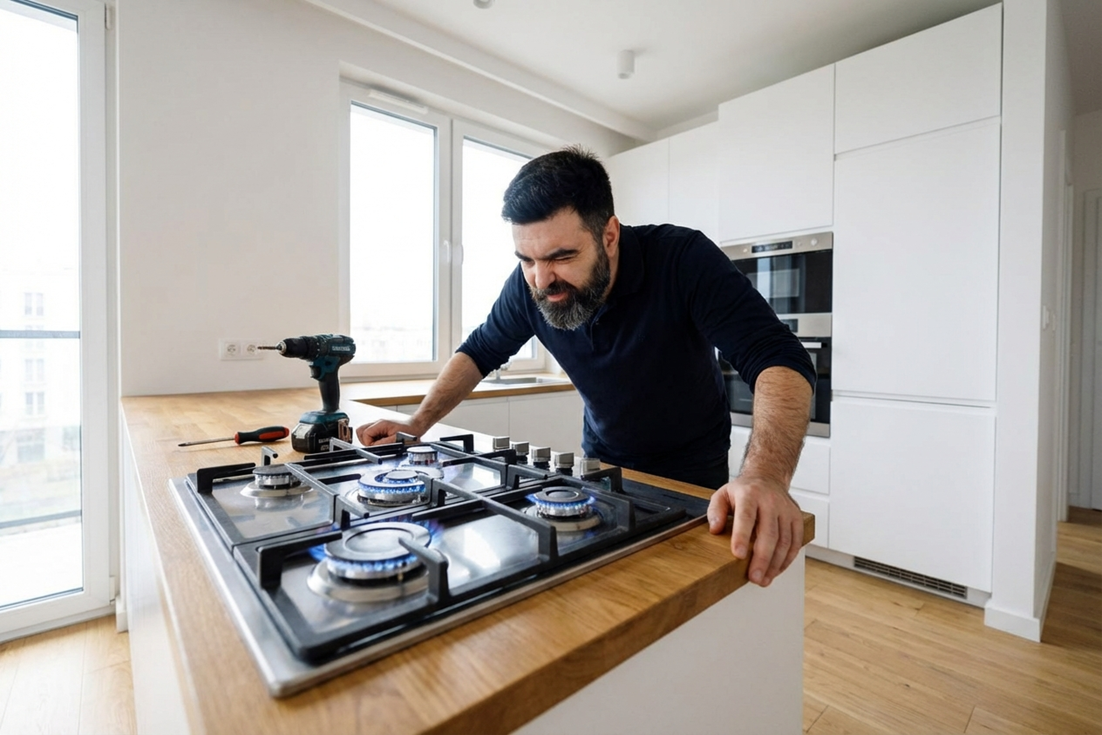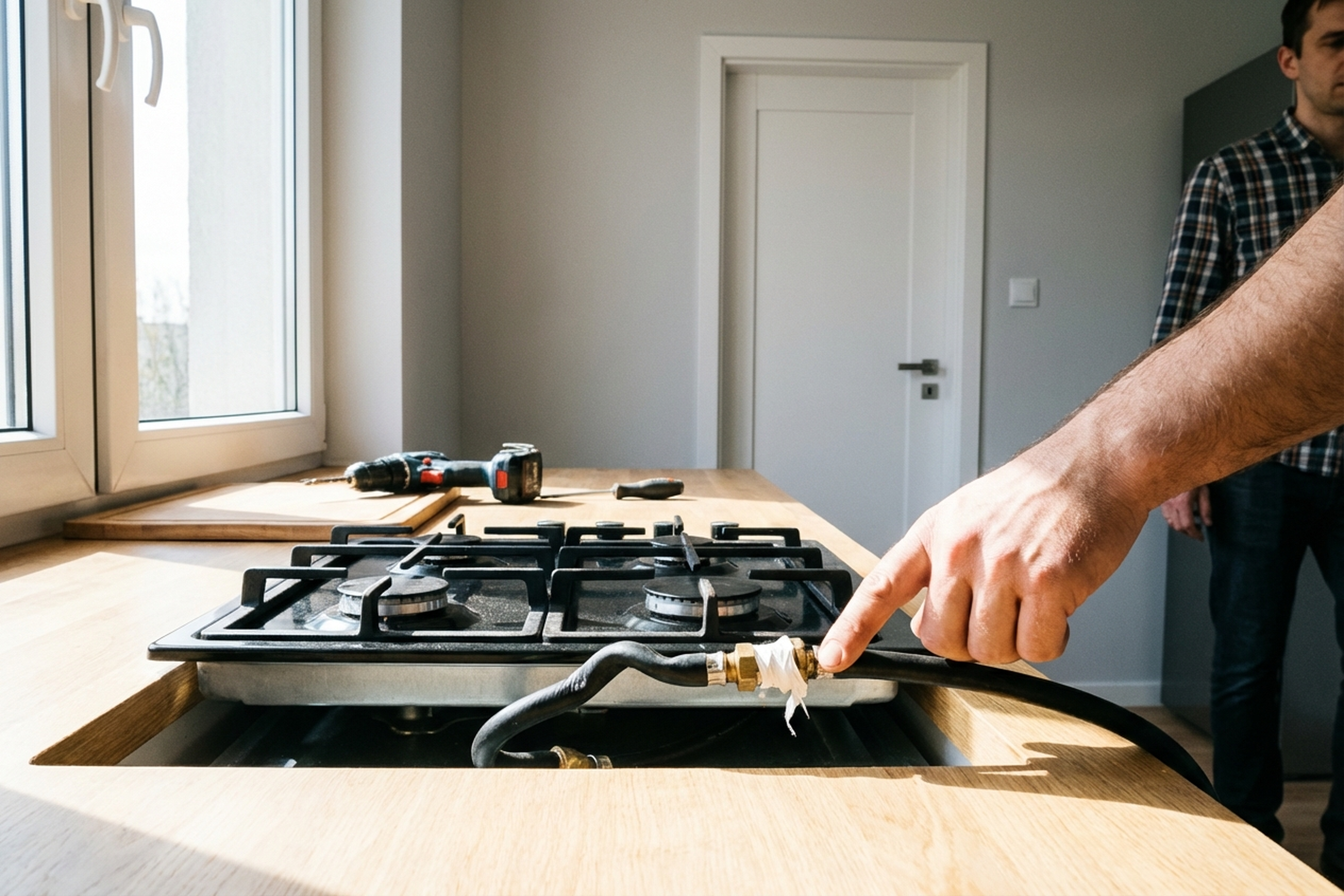 Bought a new gas hob and need it fitted into the countertop and connected to the gas supply? This is not a DIY job. In Poland, connecting gas appliances must be done by a certified gas fitter (uprawnienia gazowe). We cover all of Warsaw — from Ursynow to Bielany — and carry out connections to full code: with a flexible gas hose, a leak test using soapy water, and a signed certificate.