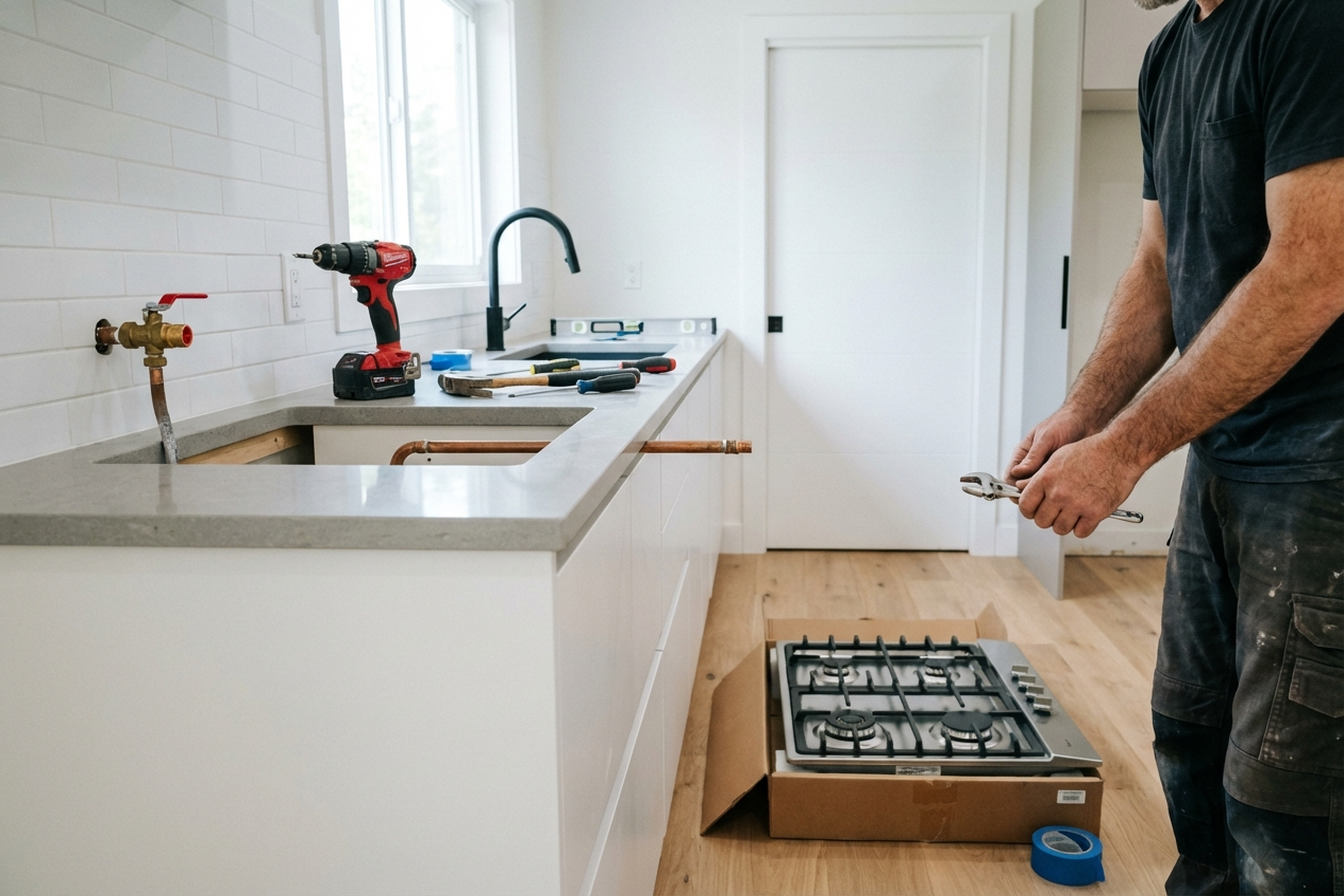 - You send photos of the kitchen, countertop, and gas outlet — the technician assesses the scope of work.