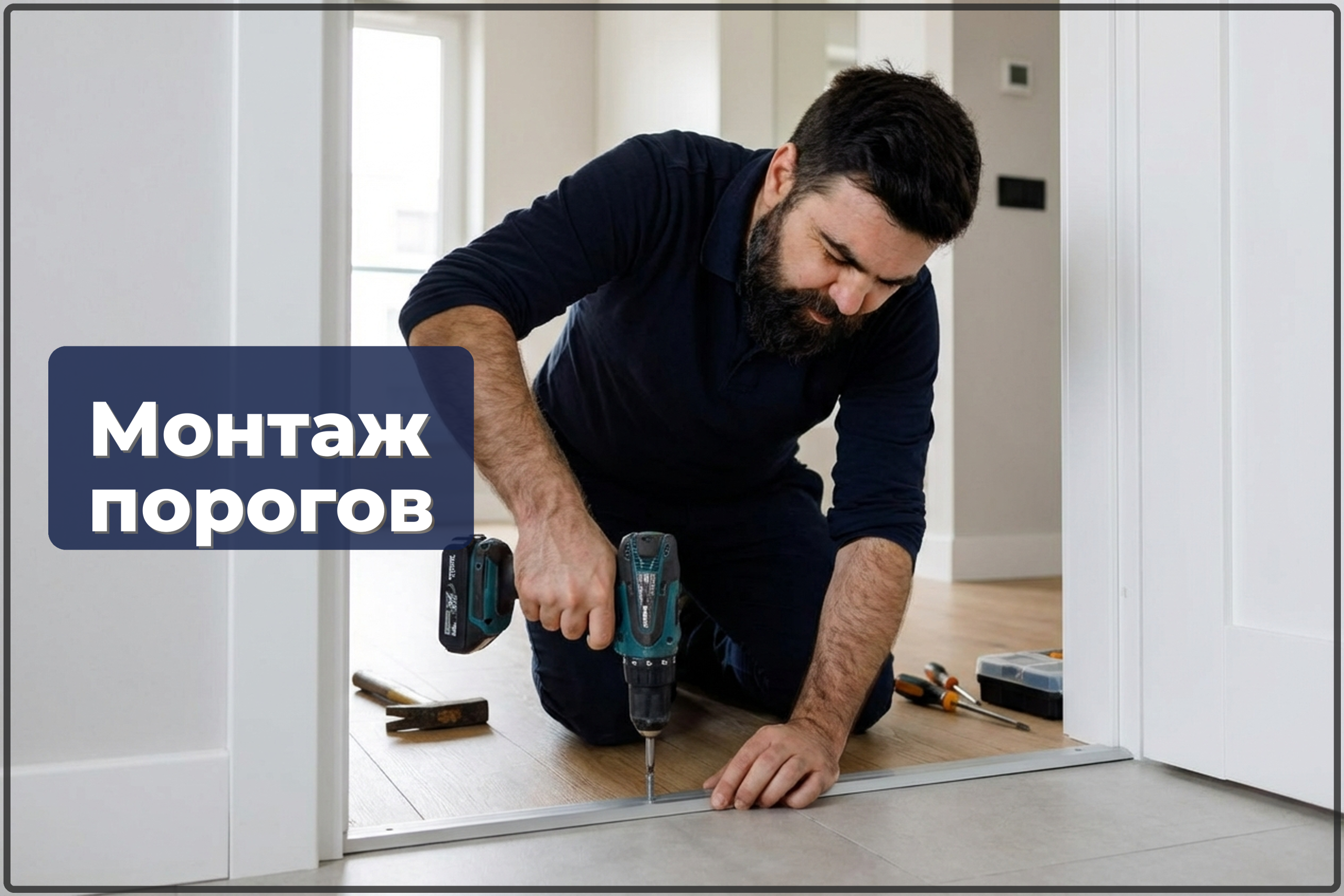 Стоимость зависит от типа порога, длины проёма и перепада высот между покрытиями. Плоский алюминиевый профиль — одна цена, разноуровневый с компенсатором — другая. Актуальные расценки на все работы с полами — в таблице ниже. Крепёж входит в стоимость, сами пороги покупает заказчик.