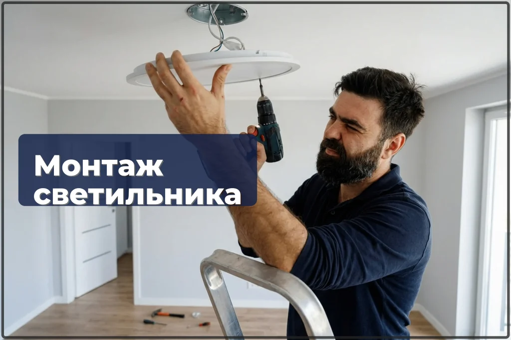 Цена зависит от типа светильника и сложности крепления. Простая потолочная люстра на крюк — быстро. Тяжёлая люстра на планку с дюбелями — чуть дольше. Встраиваемые споты — зависит от количества. Светильник покупает заказчик. Актуальные цены в таблице ниже.