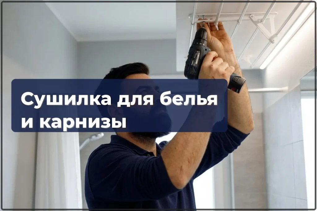 Актуальные цены — в таблице ниже. Стоимость зависит от типа стены (бетон, кирпич, гипсокартон), длины карниза, модели сушилки и высоты потолка. Крепёж входит в стоимость работы. Сама сушилка, карниз и шторы — за отдельную плату. Если стена повреждена от старого крепления — ремонт точки входит в работу.
