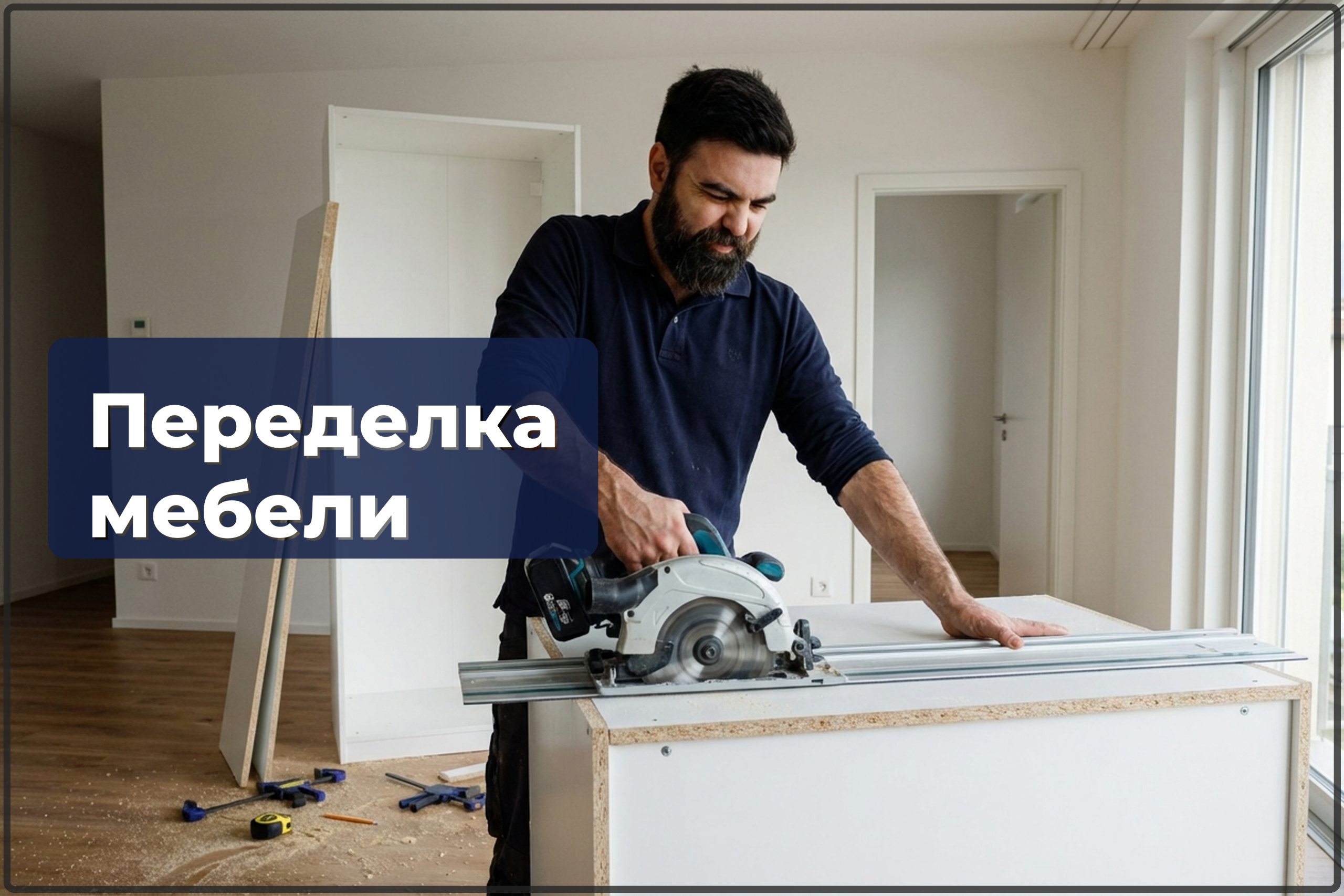 2. Согласовываем визит. Мастер приезжает с инструментом: циркулярная пила с направляющей, электролобзик, фрезер, шуруповёрт, шлифмашинка, уровень, струбцины.
