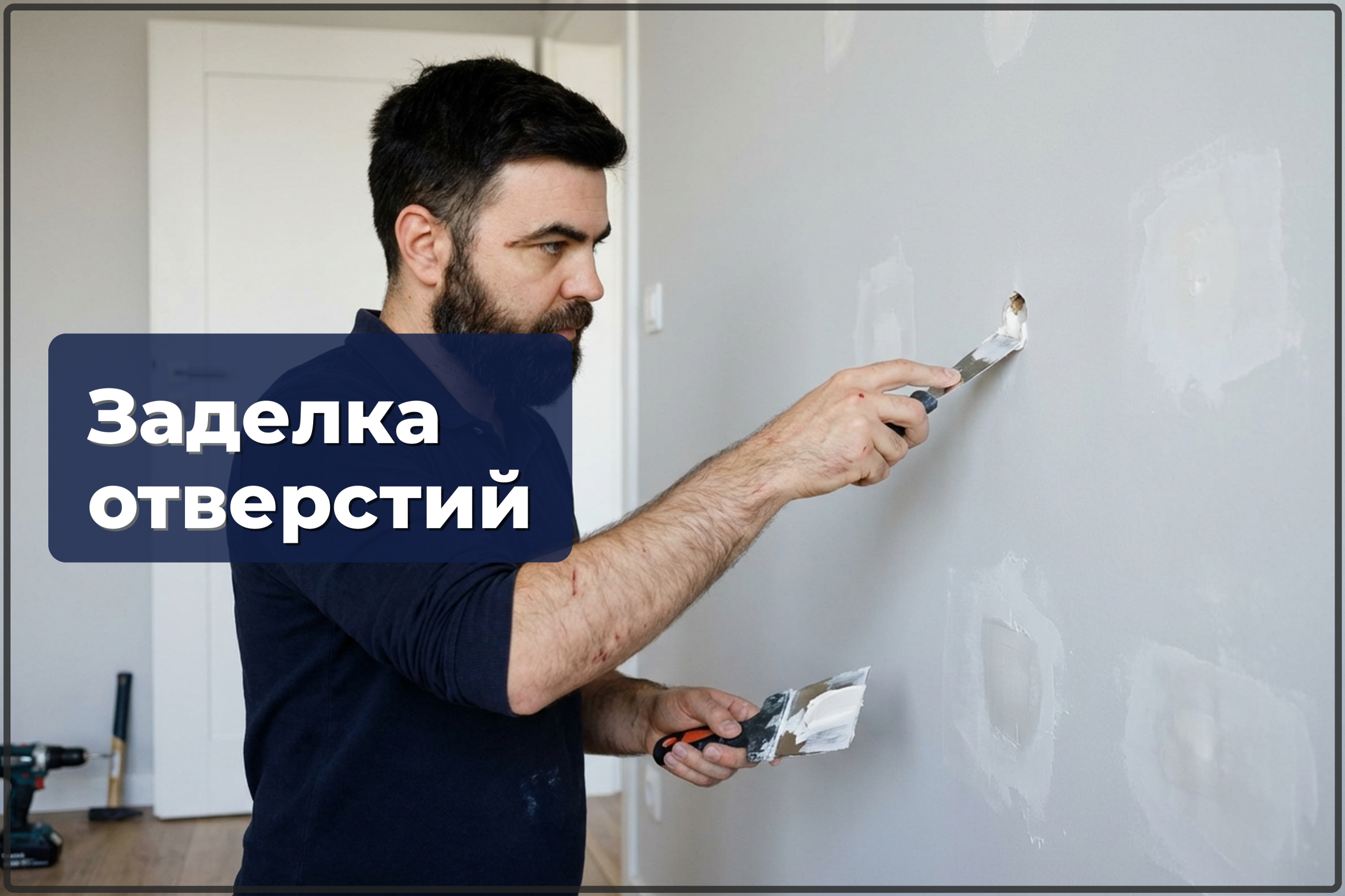 Актуальные цены — в таблице ниже. Стоимость зависит от количества повреждений, их глубины и типа основания. Мелкие отверстия от дюбелей — быстро и недорого. Глубокие сколы или трещины — нужна армирующая сетка и несколько слоёв шпаклёвки с промежуточной шлифовкой. Шпатели и наждачка входят в стоимость. Шпаклёвочная смесь — расходник, оплачивается дополнительно.