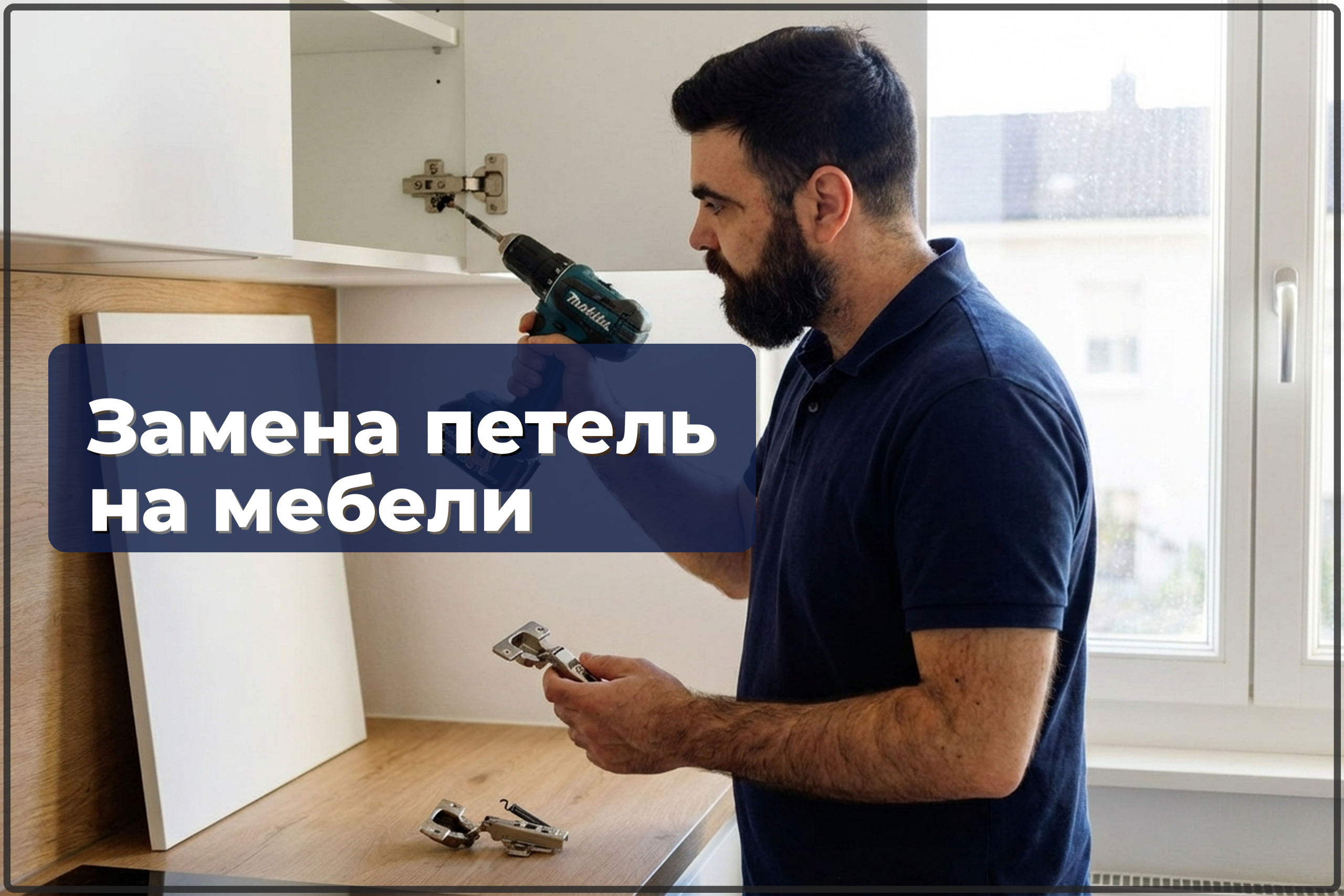 Стоимость зависит от количества петель и их типа. Замена одной стандартной петли — быстрая работа. Замена всех петель на кухне с доводчиками — отдельная история. На цену влияет: тип петли (обычная, с доводчиком, угловая, для стеклянной дверцы), состояние посадочного места в ДСП, необходимость рассверливания или установки ремонтной площадки. Стоимость петли — отдельно, работа — отдельно. Актуальные расценки в таблице.