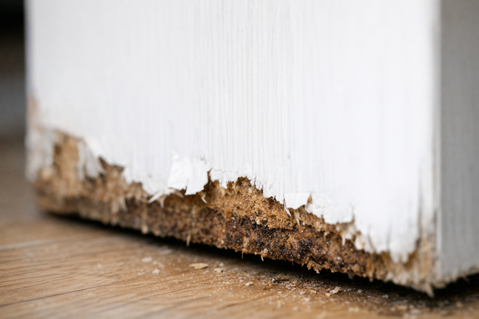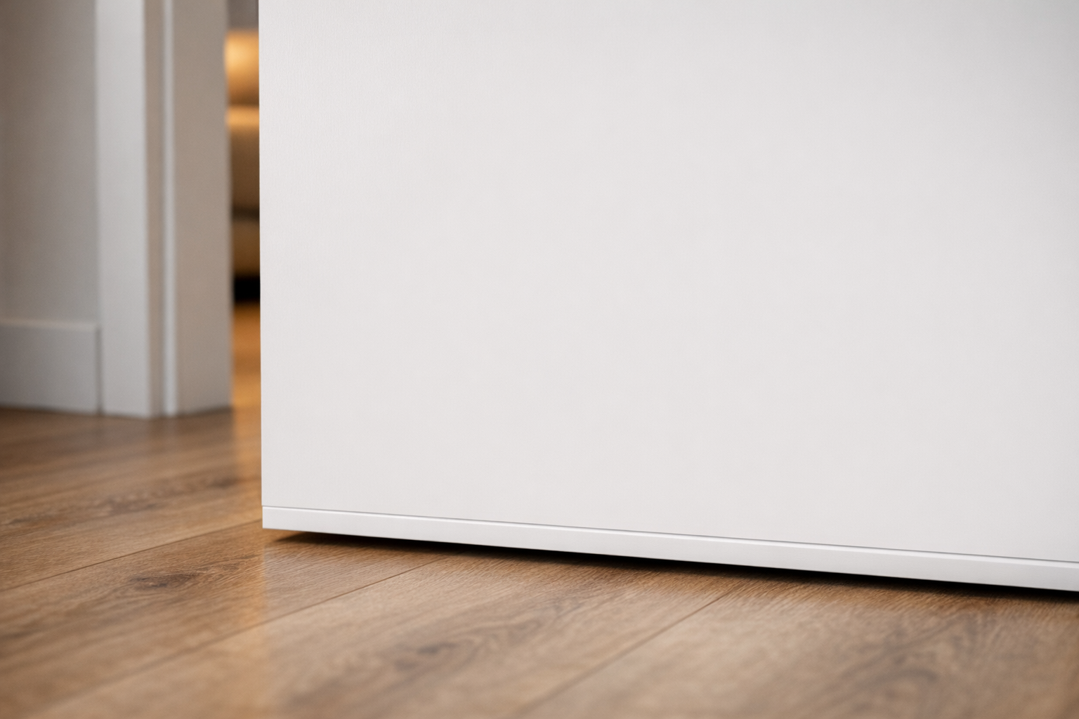 - Brak obróbki krawędzi po cięciu. Szczególnie krytyczne przy drzwiach z MDF: odsłonięty przekrój wchłania wilgoć, zwłaszcza w łazience. Po pół roku krawędź pęcznieje i się rozwarstwia.