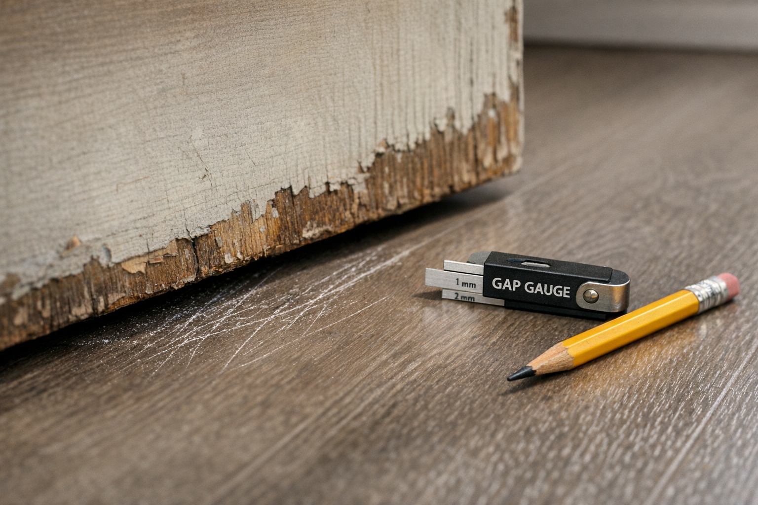 - Pomiar szczeliny. Fachowiec sprawdza, ile dokładnie trzeba zdjąć. Mierzy w kilku punktach — podłoga może być nierówna i przycięcie musi to uwzględniać. Zostawiamy luz 3-5 mm na swobodny ruch.