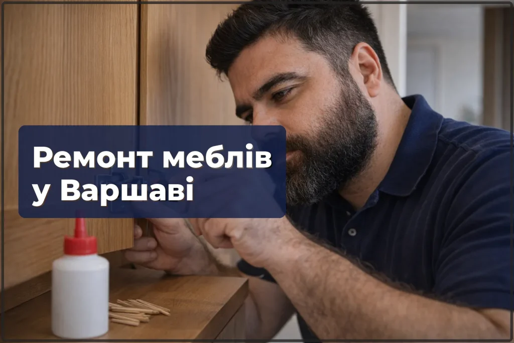 Ремонт меблів виконують майстри з досвідом роботи з корпусними меблями: ДСП, МДФ, масив. Працюємо по всій Варшаві та передмістях. Для запису зателефонуйте або напишіть — відповімо протягом години та узгодимо зручний час.